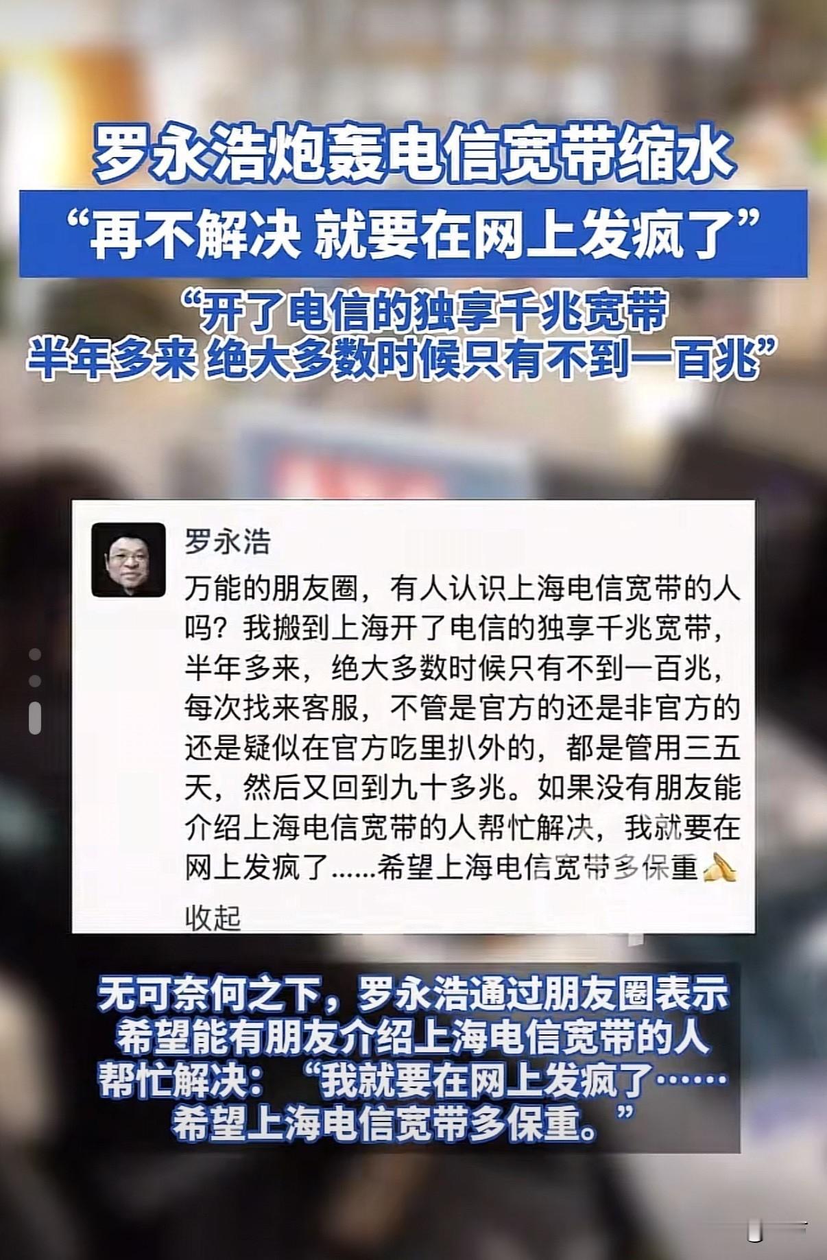 罗永浩吐槽后,上海电信做出回答了! 今天晚上,上海电信在他们的官方社交网络,发了一篇文章,专门来说明,为啥我们上网的时候有时候感觉得快,有时候感觉得慢! 这篇文章说得比较有意思,他一共列举了八种情况,包括房子的结构,设备的问题,电脑的问题,或者路由器的问题等等[捂脸] 至于罗永浩说的为什么他千兆的网络,为啥有时候只有几十兆,不到上兆照这个问题,好像回答的有点不是很透彻。 因为罗永浩还说到了一个情况,那就是每一次他把问题说了之后,运营商就会找个人来弄,结果还真的能够起作用,但最多三天,又恢复到了以前的样子[捂脸] 所以今天晚上,上海电信的文章当中,并没有提到这个情况,他也没有说,我们普通用户使用的这种前兆网络,是不是只是一个名词,而不是一个真正运行的标准。 当然,可能每个地方的情况不一样,具体情况还得具体分析,到底是什么问题会影响我们的网络稳定性,以及我们使用的所谓的千兆网络,到底有没有这个速度,估计不是三言两语就能说清楚的。 只是不知道最终罗永浩对这个回答不满意,毕竟他的诉求也很简单,那就是解决这个问题,看看他接下来会不会给上海电信来个回馈。