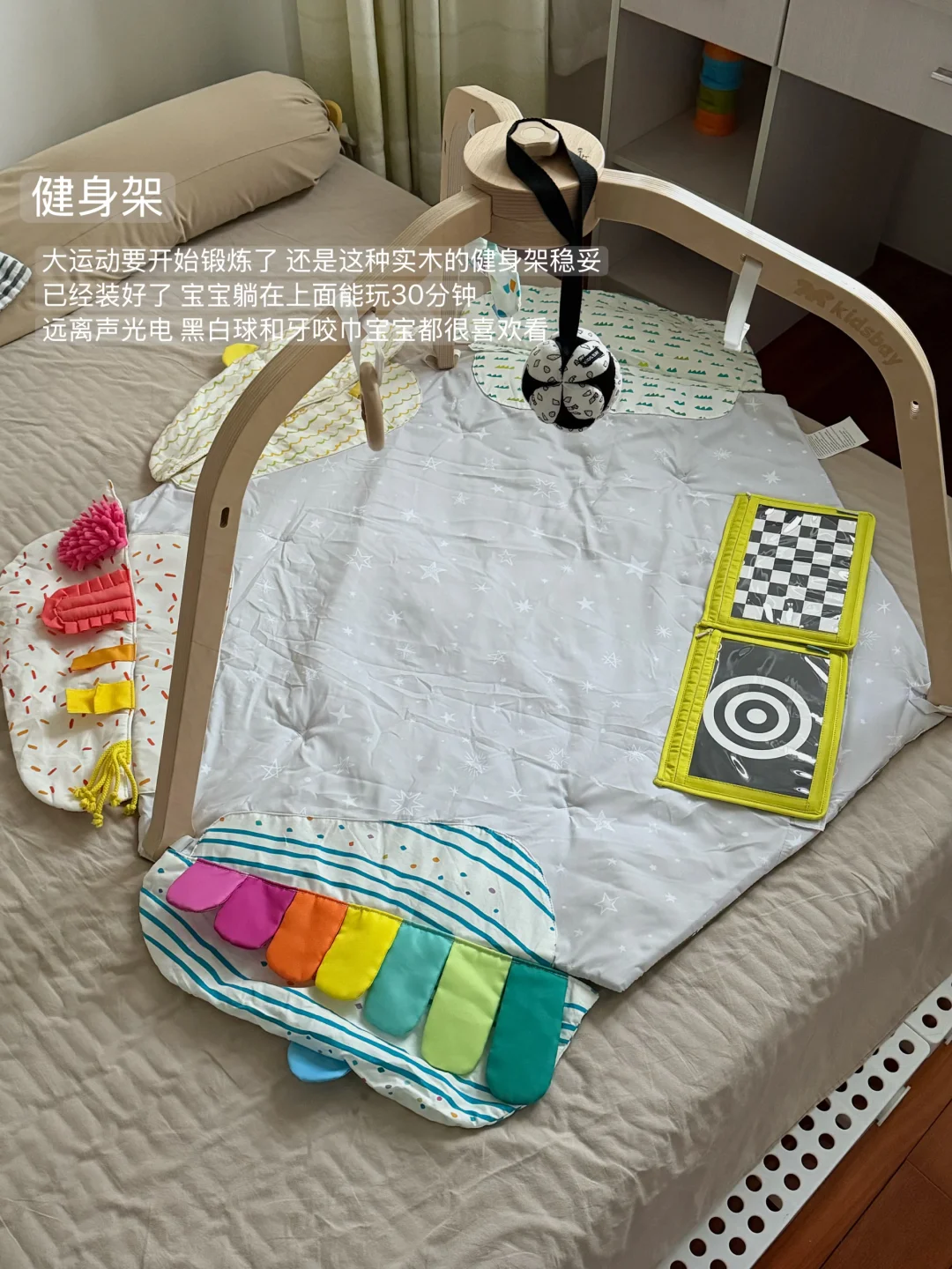 孕期已经准备好的健身架,接近三月龄终于装好了,给宝宝练习大运动,为翻身准备。市面上有各种材质,还是实木最稳妥,远离声光电,宝宝在上面能呆好久,黑白球和牙咬巾宝宝很爱看,会爬的时候再进一步视觉触觉练习。