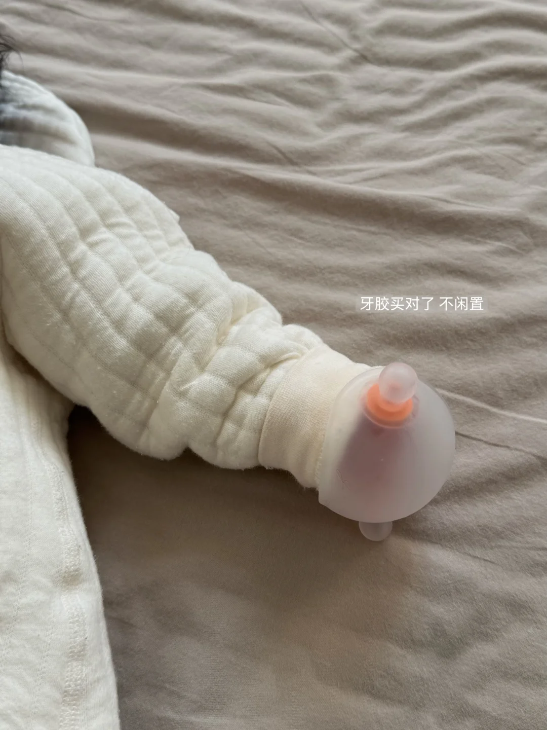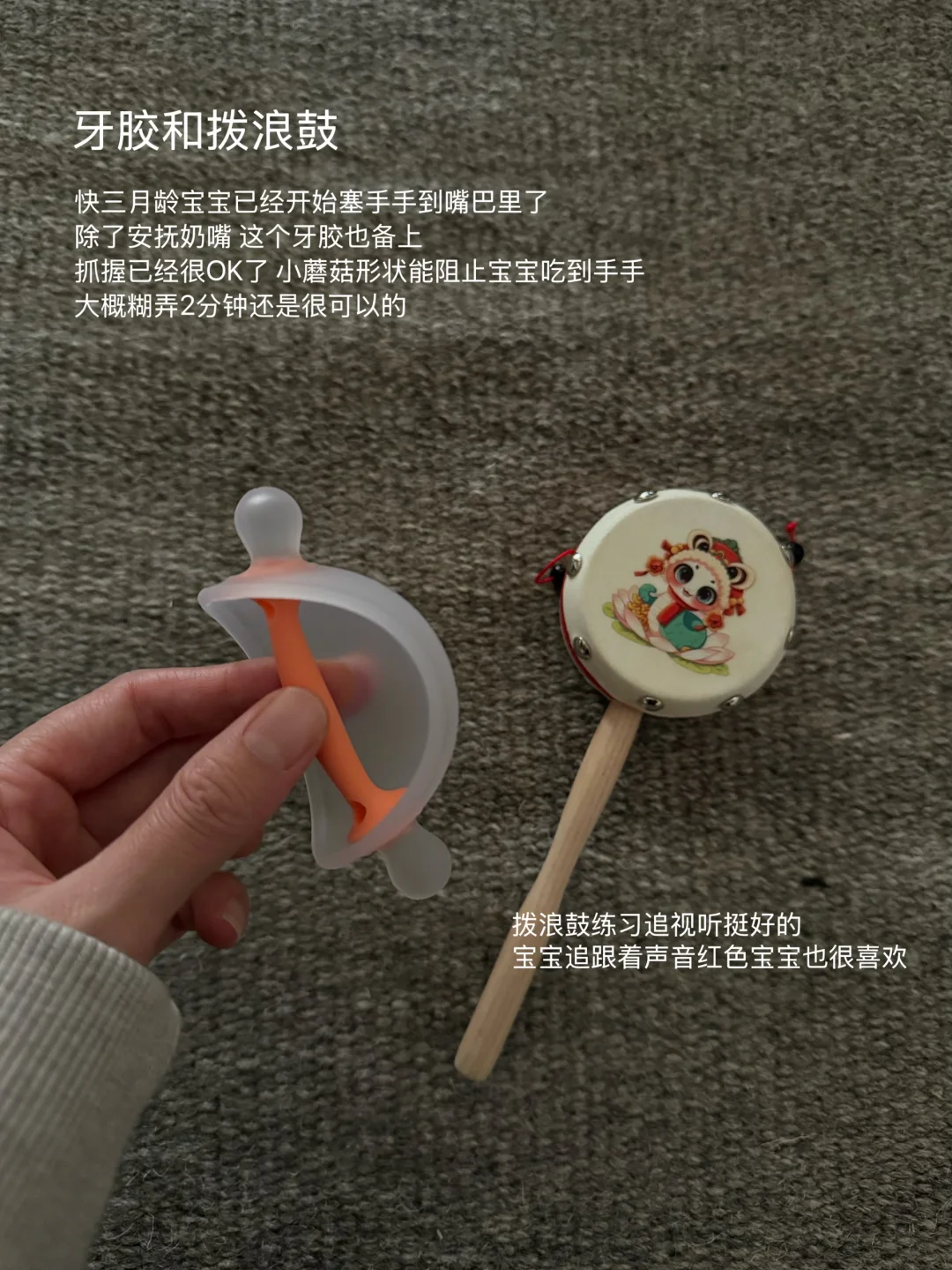 快三月龄的宝宝已经开始吮手指了,直接把手塞嘴里。除了安抚奶嘴外,牙胶也备上了。抓握训练加上小蘑菇形状阻止宝宝吃到手。