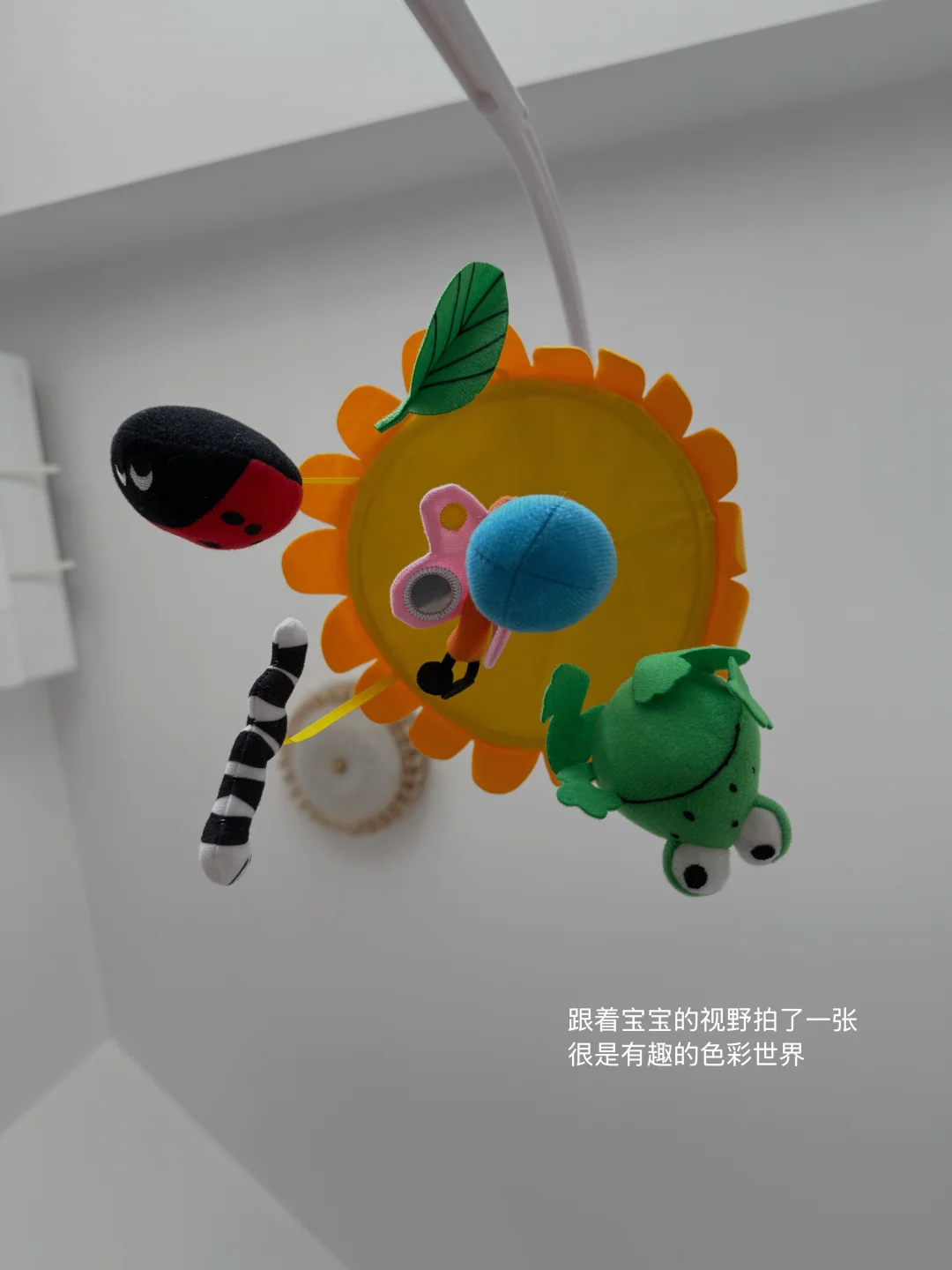 孕期也准备好的床铃,真的用回本了。每次吃奶后放婴儿床上就能安静呆20分钟,跟着宝宝视野拍了一张,很是有趣的色彩世界。配上床铃架,看10分钟就可以移开让宝宝眼睛休息。