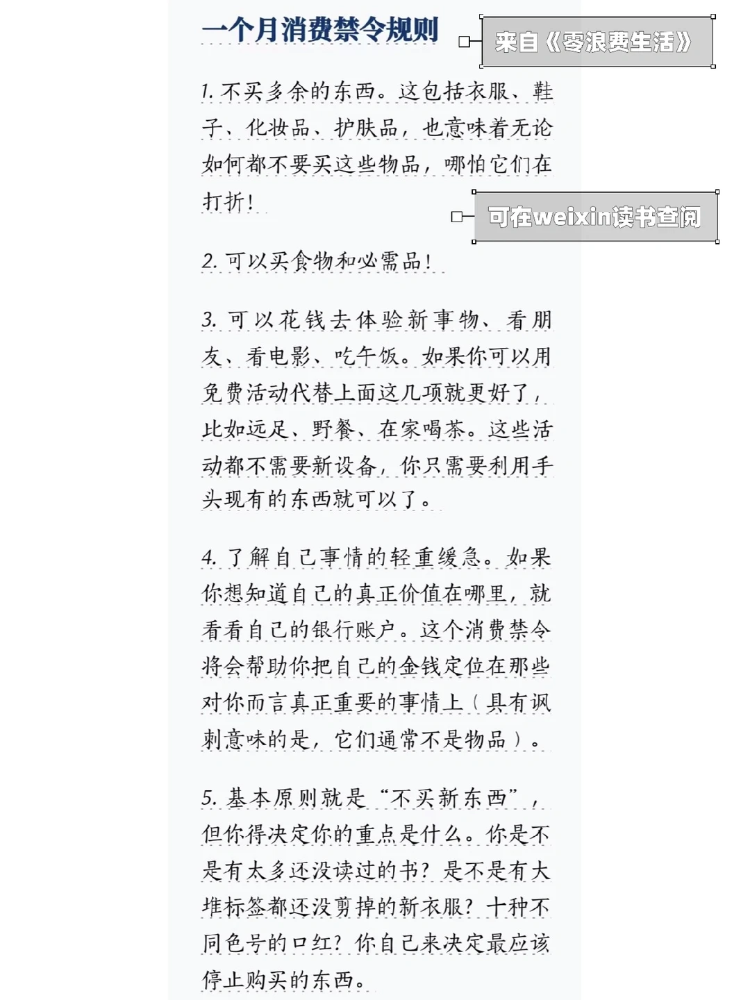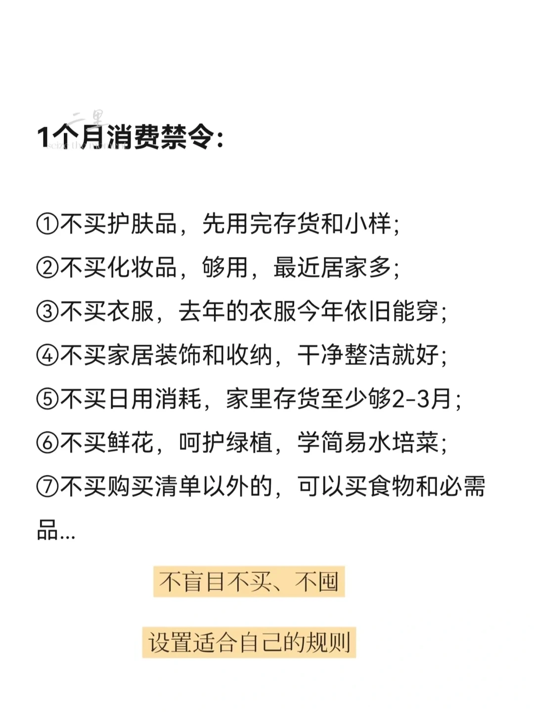4月初,我在做月度购买清单时,发现本月没有新的需求,都是顺延了3月计划的不紧急项。3月是不经意达成了“零消费”,本月我想刻意练习一下,原因有以下: ▪️省钱 下月起家庭有重要的持续支出,且疫情之下更要增加储蓄,加强抗风险能力。 ▪️物尽其用 分清需要和想要,拒绝不必要浪费。家里有的物品已经很多,物尽其用发挥它们的最大价值。 ▪️简单生活 思考真正重要的事和想做的事,它们往往不是物质;用心感受生活,体会物质之外的愉悦富足。 ▪️提升专注力和行动力 不为物累,专注更多的时间精力在自己想要尝试的事情上,提升行动力,让自己进步多一点。 设置1个月消费禁令(《零浪费生活》的启示): ❶不买护肤品,先用完存货和小样; ❷‎不买化妆品,够用,最近居家多,需要少; ❸不买衣服,去年的衣服今年依旧能穿; ❹不买家居装饰和收纳,干净整洁就好; ❺不买日用消耗,家里存货至少够2-3月; ❻不买鲜花,呵护现有绿植,学简易水培菜; ❼不买计划清单以外的,可以买食物和必需品... 你也可以试着列出适合自己的消费禁令,尤其是对于那些让你忍不住剁手的物品(图片附书籍作者的禁令规则供参考)。只买我们真正需要的东西,设置适合自己的规则。 在这之前,分享可能有用的做法:清点自己的资产积蓄,记录每一笔花销知道钱都花哪了,盘点家里的物品,尤其是每天都在消耗的物品,不要盲目不买、不囤。不是强行一次性做到零消费,而是慢慢尝试适合自己的方式。 零消费不是一个数字,是目标、是理念,是微小的改变和行动。愿我们都能体会消费之外的满足和喜悦。 🌿🌿🌿 简单生活 |持续学习 |悦己爱人 记录在这 分享给你 ✐二里