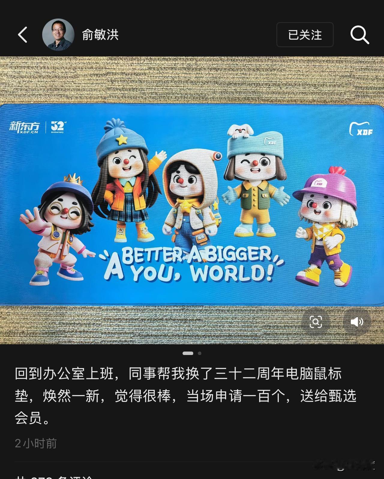俞敏洪从南极回到北京了,有朋友接机。到公司后发现同事给他换了新的32周年鼠标垫,还要送100个给东方甄选会员。你说大方不大方?
