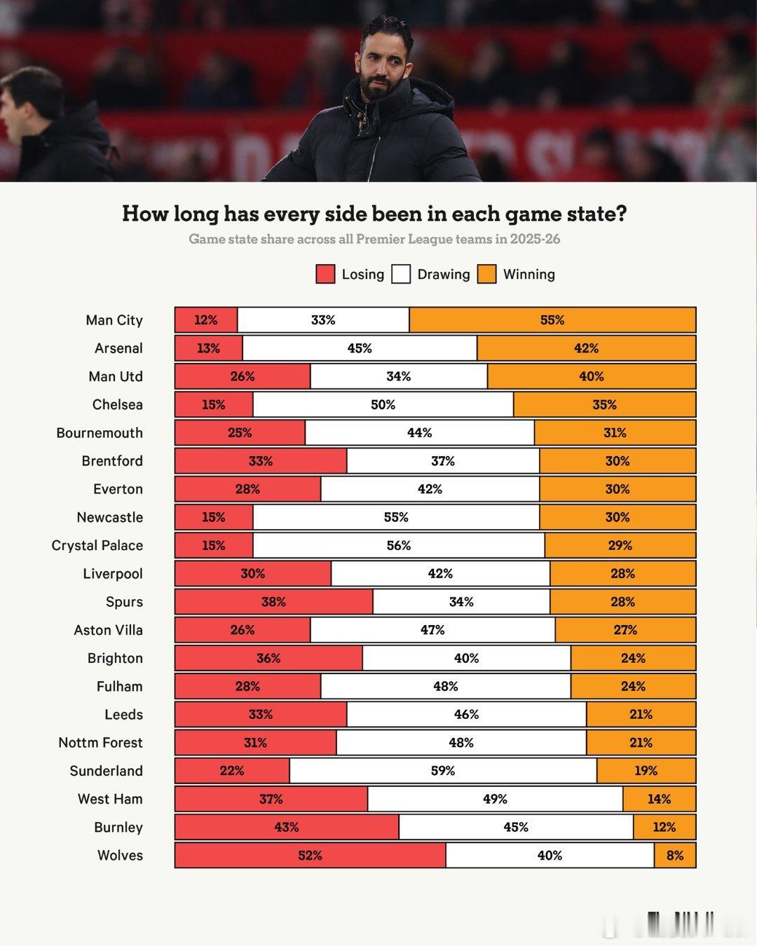 The Athletic :曼联本赛季的显著问题之一正是在取得领先后难以掌控比赛节奏。自2025-26赛季开始以来,球队屡次在比赛中率先破门,却随即陷入被动并最终失球。数据显示,本赛季曼联在16场英超比赛中有11场能够率先取得进球,比赛中处于领先优势的时间占比达到40%,仅次于阿森纳(42%)和曼城(55%),位列联赛第三。然而,球队在领先时的表现往往缺乏维持比分所需的控制力,这已成为制约成绩稳定性的关键短板。