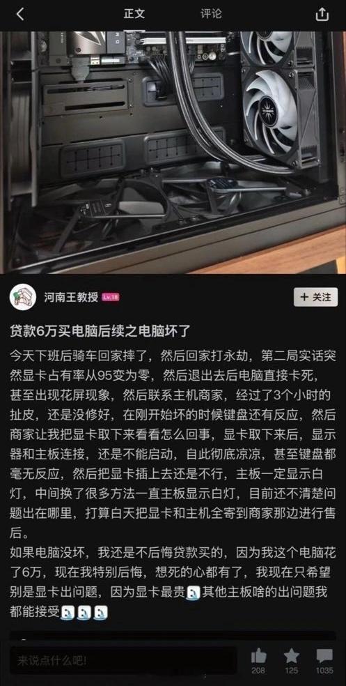 月入六千敢贷款六万买电脑,买个六万的电脑还玩永劫无间,最后热插拔把显卡弄坏了。评价为没有斩杀线导致的。😅