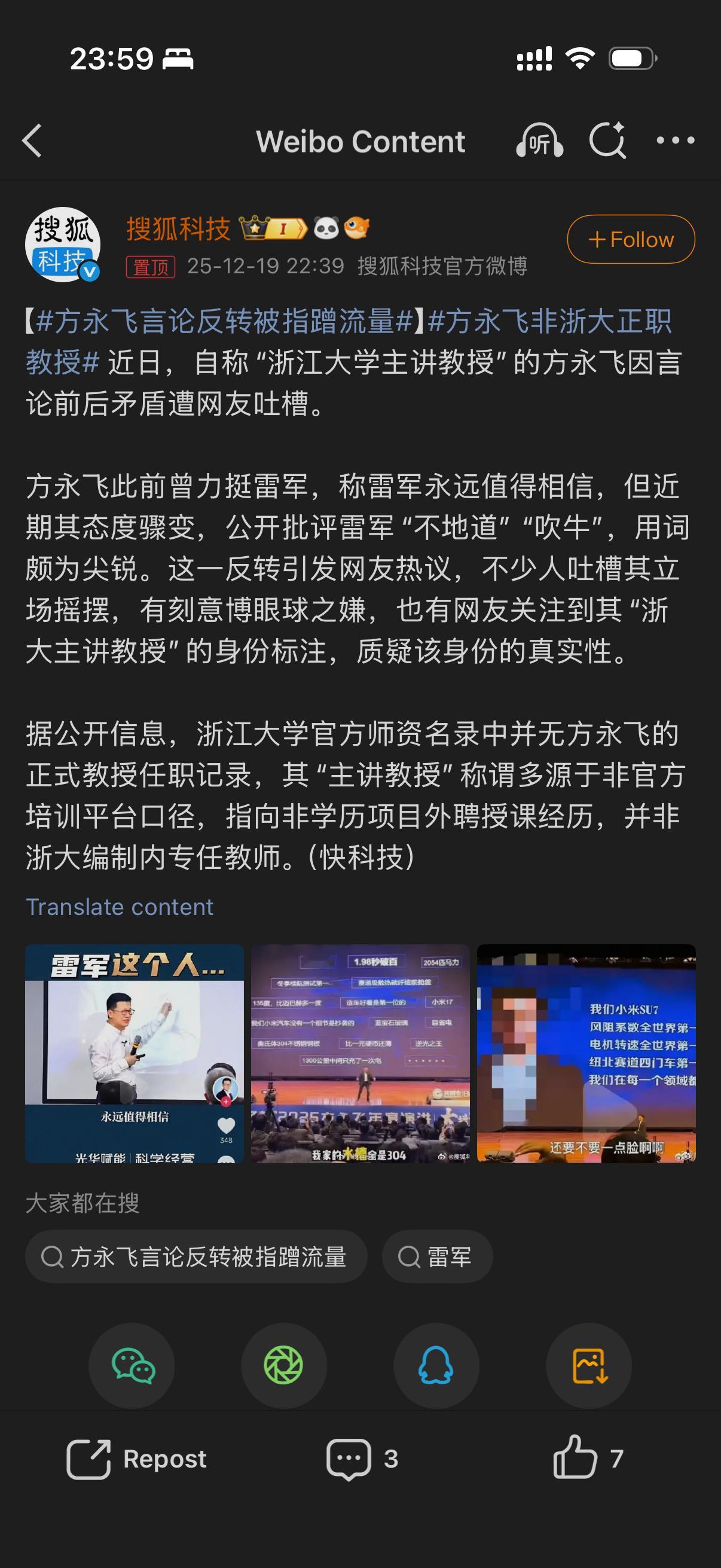 方永飞言论反转被指蹭流量方永飞非浙大正职教授不是一般恶心人啊,视频看了,主打就是无底线的“蹭流量”,而且这人不是什么教授,更不是浙大正职教授,我也在读博,遇到的教授都没有这种发言不过脑子的,在公开场合的言论变动属实逆天没事少折腾吧,“流量”与“真实”的博弈,居心不良的用流量绝对会反噬自己