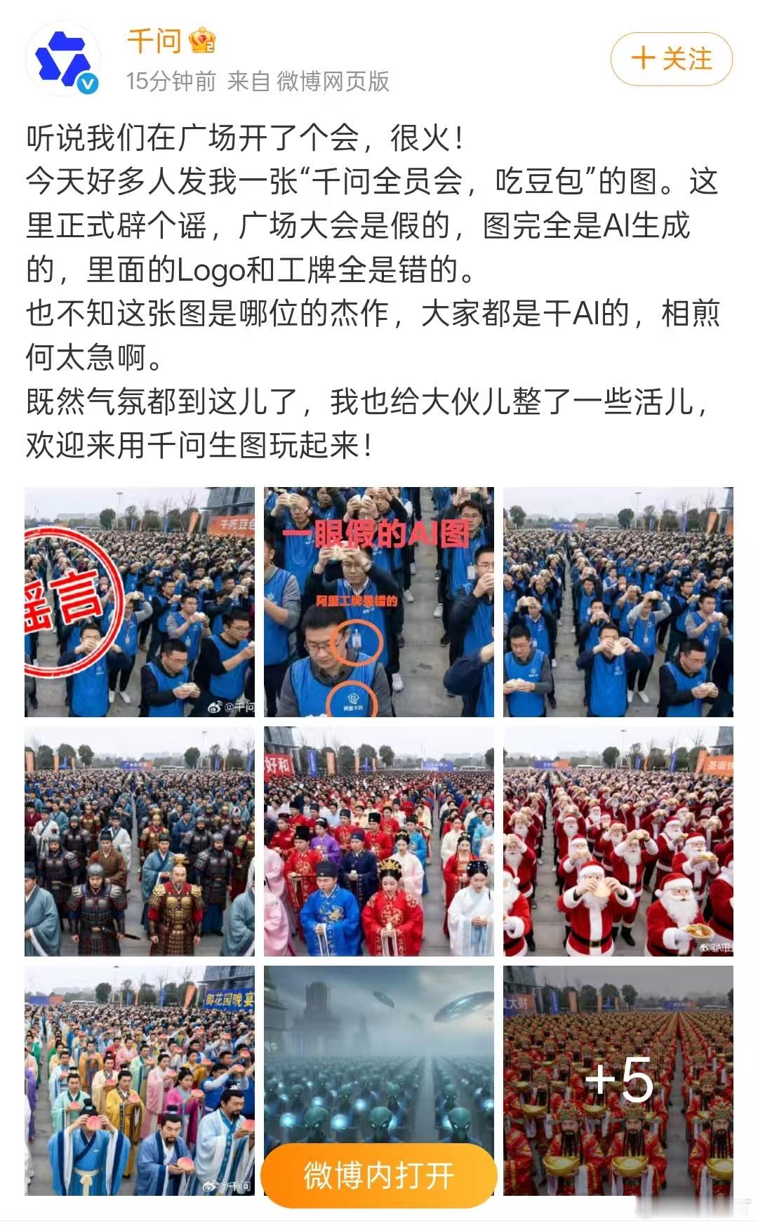 阿里千问开全员会标语干死豆包系谣言 最近两天,网传千问手撕豆包的传闻,在互联网上疯传。虽然乍看起来像模像样,但却是谣言无疑。据了解,相关图片由AI生成。相关图片到底是谁生成的,咱是不知道。但咱知道的是,利用AI造谣的戏码,没劲但坏到骨子里。因为,前AI时代,讲究的更多是有图有真相,现在用AI生成图片,在视觉上的欺骗性太强。不过,甭管有无AI,在信息还处于混沌态时,不转发、多求证,都是正确的做法。别吃瓜不行,把自己搭进去。当然,鉴于网传图片实在太假,目前已被千问官方下场整活。感觉造谣者是偷鸡不成蚀把米。本来想抹黑的,结果却成了产品体验入口。这一波,算千问棋高一着。阿里千问辟谣全员大会吃豆包图