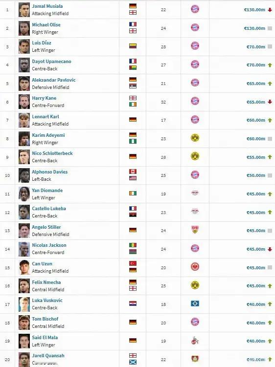 今日德转更新德甲身价,穆西亚拉身价下跌1000万欧至1.3亿欧,与奥利塞并列第一,于帕梅卡诺身价上涨1000万欧至7000万欧与迪亚斯并列第三,凯恩身价下跌1000万至6500万欧,与帕夫洛维奇并列第五,卡尔身价上涨4000万欧至6000万欧。德转管理员对于穆西亚拉和凯恩的评语是:穆西亚拉仍在从重伤中恢复,目前还无法准确预见他何时能重返赛场。凯恩的身价下降则完全是由于年龄增长,这是凯恩身价连续第四次下降,这次下降了1000万欧。