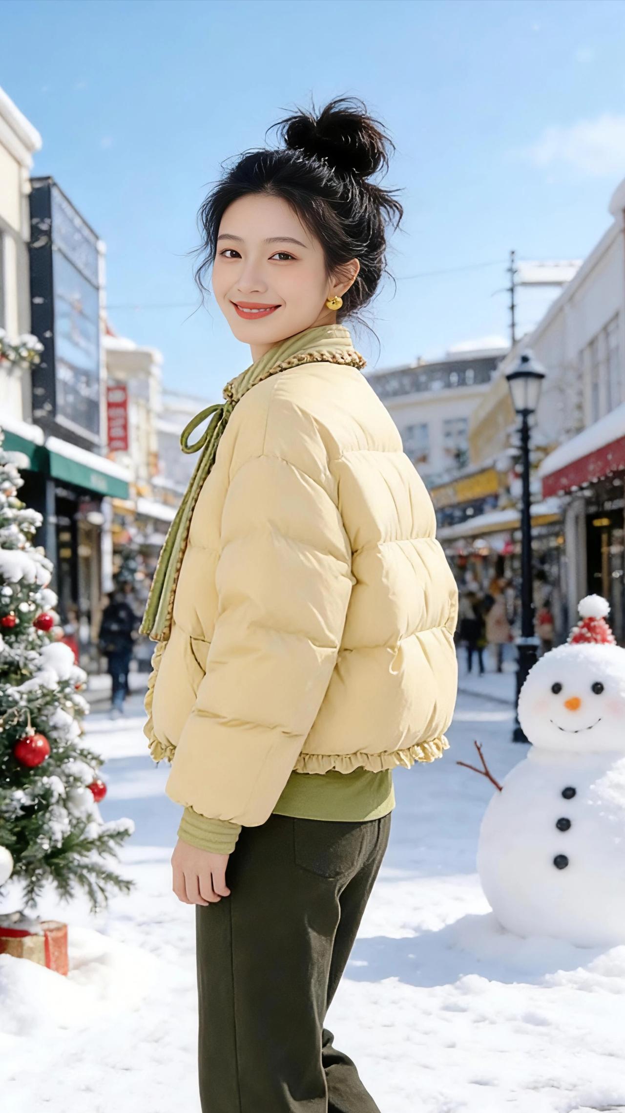 暖黄绒雪,圣诞序章 雪把商业街揉成了蓬松的奶油色,晴空蓝得像刚拆开的糖纸,风卷着细雪沫子掠过街角,圣诞树缀着的红珠与金铃轻轻晃,雪人的红围巾在风里飘出温柔的弧度,冬日的冷意,都被这方天地的甜暖揉化了。 她站在雪色里,姜黄色的短款羽绒服像揣了一捧冬日的暖阳,领口的绿纹系带垂着软糯的褶皱,衣摆的木耳边轻轻卷着,与雪地的白撞出温柔的层次感。墨绿的长裤衬得身姿纤细,米白的鞋履踩在雪上,像落了两片轻盈的云,乌黑的头发挽成蓬松的丸子头,几缕碎发被风拂在颊边,衬得肌肤莹白如雪。 浅红的唇瓣弯起时,像圣诞树上那颗最甜的糖心,明亮的眼妆让眸光盛着晴空的蓝,也盛着少女独有的鲜活。挥手的瞬间,姜黄色的衣袖扬起,像衔着暖阳的黄莺掠过雪街;手托衣领侧身而立,又带着几分娇俏的灵动,衣料的软与雪的凉相映,成了冬日里最暖的笔触;双手拢出心形的那一刻,连凛冽的风都化作绕指柔,暖黄的羽绒裹着这份甜,揉进了圣诞的雪色里。 转身时,羽绒服的后背线条蓬松又温柔,墨绿裤装的弧度与雪地相融,她的笑靥落在雪光里,像圣诞礼盒里藏着的惊喜,把少女的明媚,嵌进了雪与圣诞装饰交织的浪漫序章里。阳光穿过枝桠洒在她身上,姜黄色的衣料被照得愈发温暖,这一条街的雪景,高级感穿搭 新年好运红我先穿上了 我的圣诞新衣测评 穿和搭时两回事