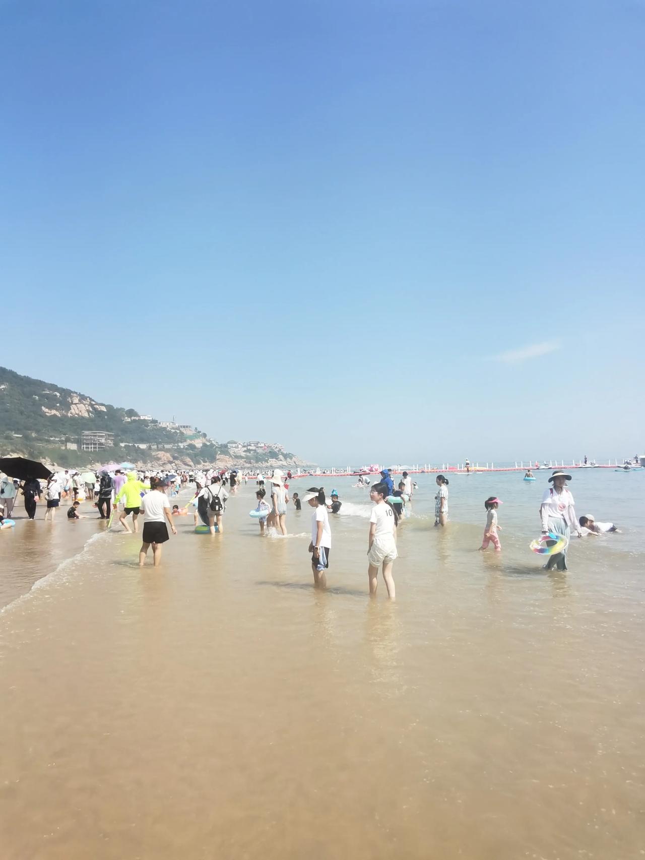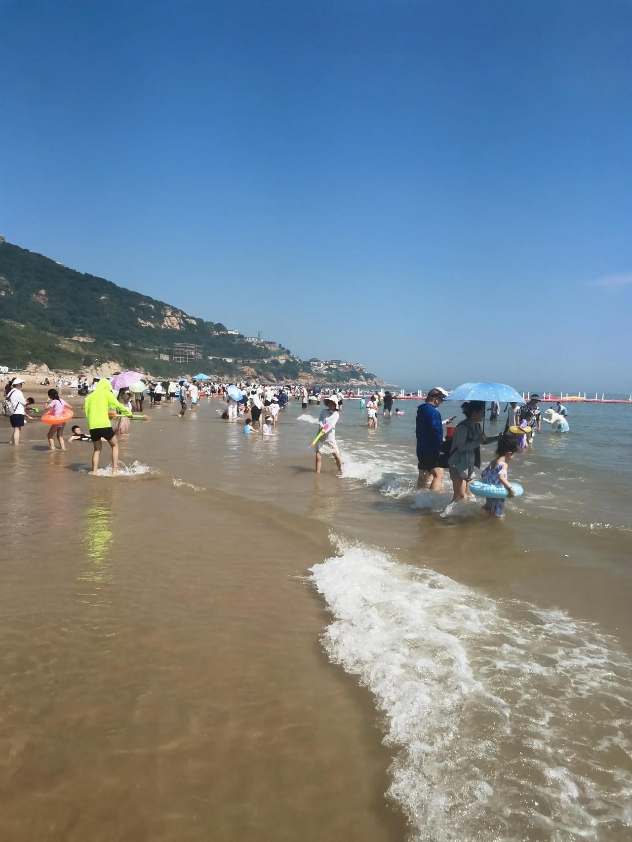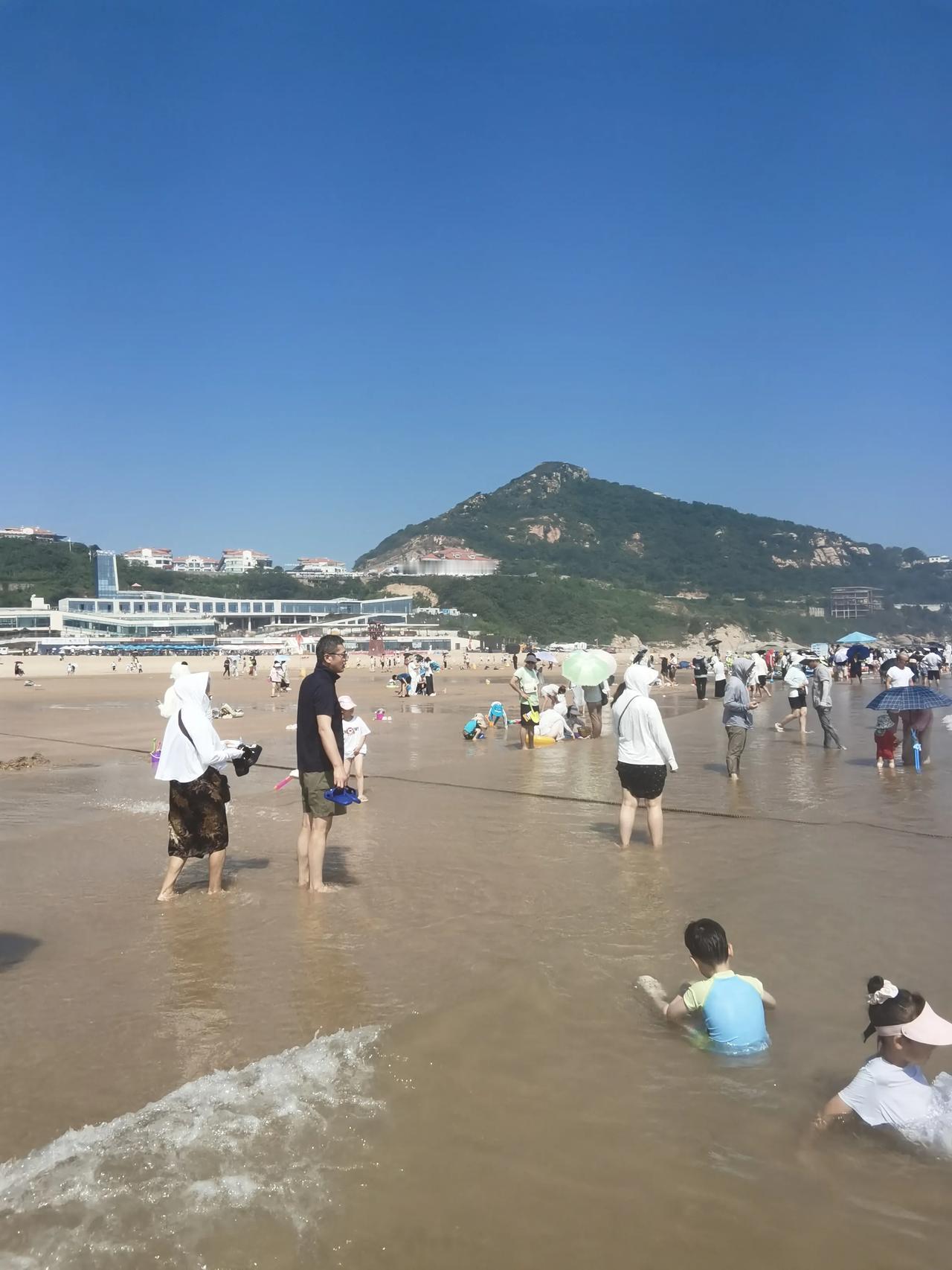 海滩的诱惑力 我从小以来就没在海边居住过,历史上曾到东北大连的老虎滩公园海边玩过,眺望了一望无际的大海,由于不会游泳,也只是光着脚在海水里走走,还好那次还乘航去了烟台。 后来也去了浙江欣赏到了钱塘江大潮,一览了汹涌澎湃的大潮雄姿,也算第二次近距离接触了大海。 前段时间,孩子带我们去了江苏连云港这座美丽的海滨城市,我们第一天去了江苏第一大岛、5A级风景区一一连岛两大优质海滨浴场之一的大沙湾浴场。 这里集青山和碧海于一体,沙质细腻、海水湛蓝清澈见底,特别适合亲子戏水、打卡拍照和观赏日落,所以这里远近闻名,每到夏季来临,许多国内外游客都从万里千里之外慕名而来赏识这里独特的风光,畅享大自然赐予的欢悦。 所以这里每天都是人山人海、沸沸扬扬,尤其是这里成了的孩子们游乐的天堂。他们有的游泳,有的戏水,玩的不亦乐乎。一到这里就乐不思蜀、几乎忘记回家。 也难怪,大热天,人们泡在海水里,不但达到降暑防暑降温的效果,还能愉悦心情。特别是孩子们传来的阵阵喝彩声、打闹嬉笑声,也都给大人孩子们都带来无限的快感,有可能在这里泡上一天也不厌其烦。 同时据说晚上还有其他别有风情的特色活动,但因有事遗憾错过机会,就无奈等待日后补课了!