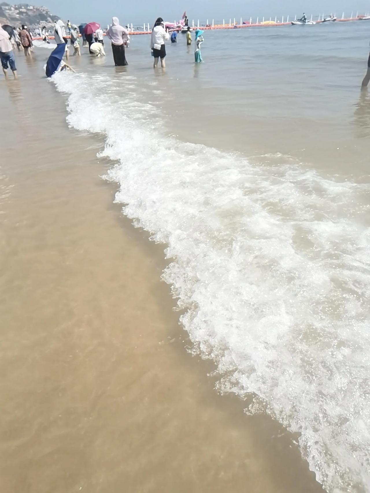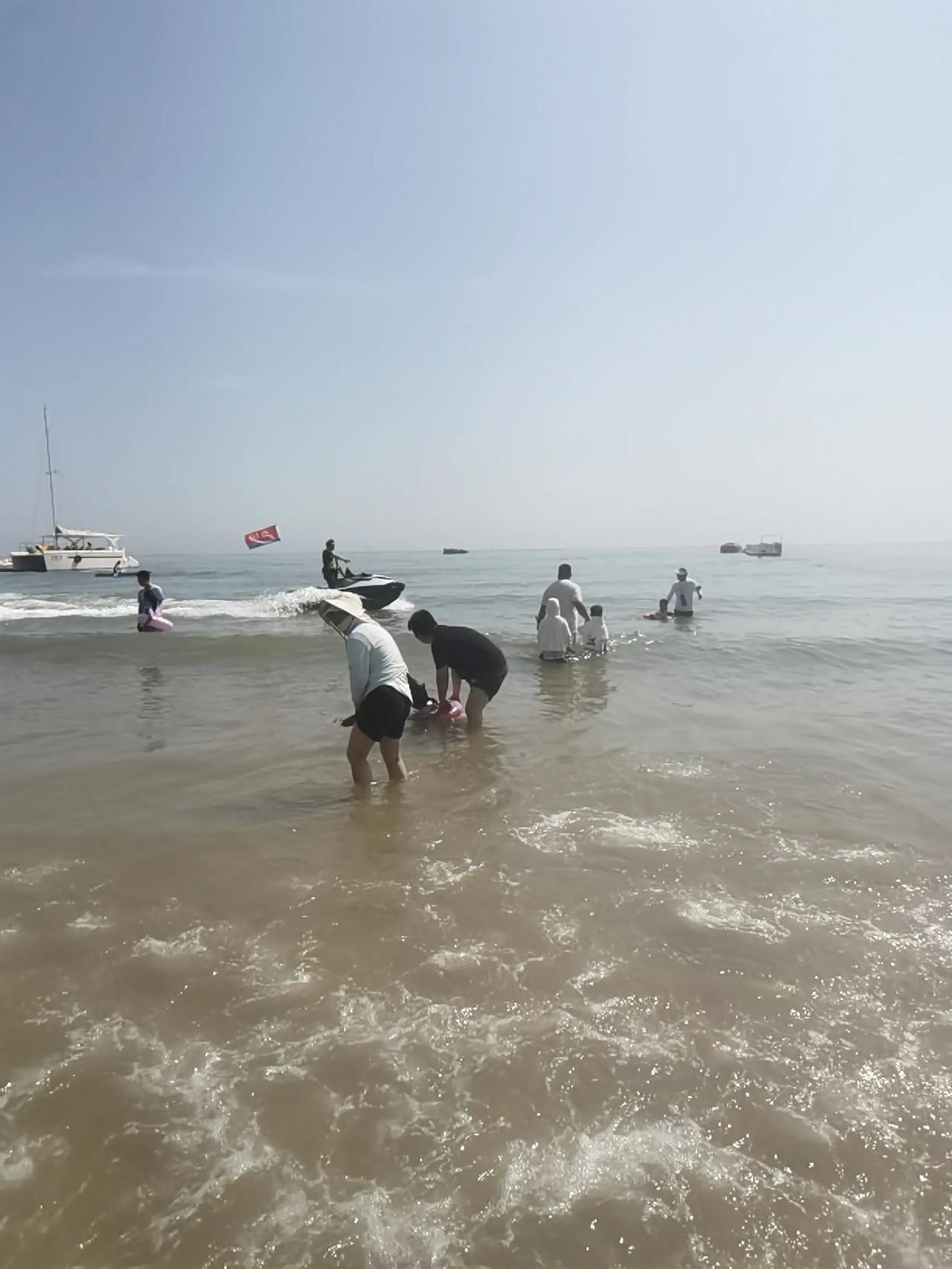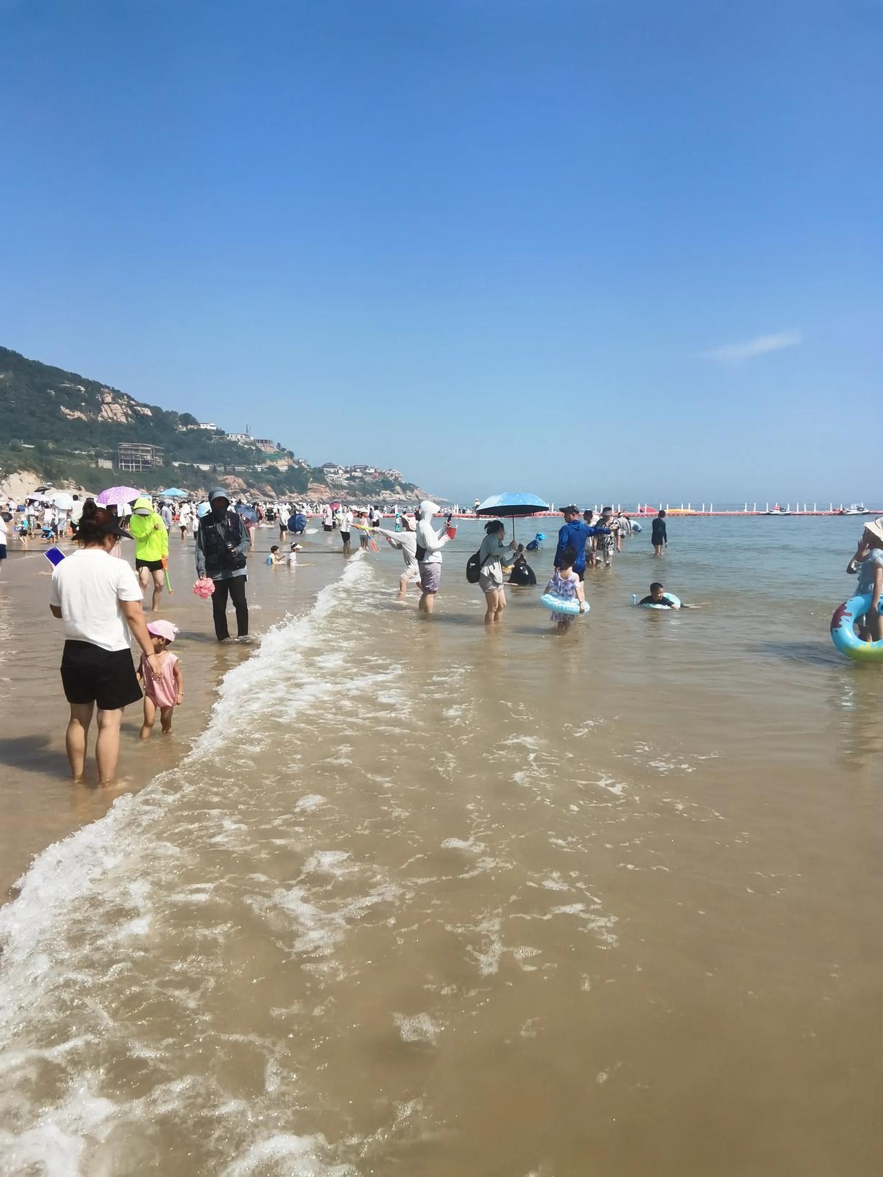 海滩的诱惑力 我从小以来就没在海边居住过,历史上曾到东北大连的老虎滩公园海边玩过,眺望了一望无际的大海,由于不会游泳,也只是光着脚在海水里走走,还好那次还乘航去了烟台。 后来也去了浙江欣赏到了钱塘江大潮,一览了汹涌澎湃的大潮雄姿,也算第二次近距离接触了大海。 前段时间,孩子带我们去了江苏连云港这座美丽的海滨城市,我们第一天去了江苏第一大岛、5A级风景区一一连岛两大优质海滨浴场之一的大沙湾浴场。 这里集青山和碧海于一体,沙质细腻、海水湛蓝清澈见底,特别适合亲子戏水、打卡拍照和观赏日落,所以这里远近闻名,每到夏季来临,许多国内外游客都从万里千里之外慕名而来赏识这里独特的风光,畅享大自然赐予的欢悦。 所以这里每天都是人山人海、沸沸扬扬,尤其是这里成了的孩子们游乐的天堂。他们有的游泳,有的戏水,玩的不亦乐乎。一到这里就乐不思蜀、几乎忘记回家。 也难怪,大热天,人们泡在海水里,不但达到降暑防暑降温的效果,还能愉悦心情。特别是孩子们传来的阵阵喝彩声、打闹嬉笑声,也都给大人孩子们都带来无限的快感,有可能在这里泡上一天也不厌其烦。 同时据说晚上还有其他别有风情的特色活动,但因有事遗憾错过机会,就无奈等待日后补课了!