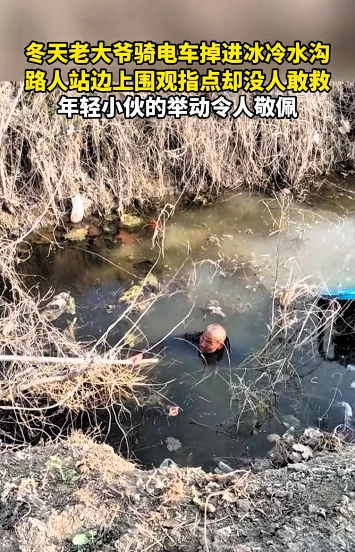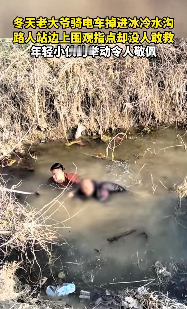 【这一跳,真帅!】刺骨河水,深不见底,围观人群焦急却犹豫。65岁大爷连人带车跌入水沟,浑身湿透,挣扎渐弱。 岸边指点的多,敢下水的却没有。 就在这时,一道年轻身影拨开人群,外套一脱,手机一扔,扑通一声跳入水中! 冰水瞬间没到胸口,他咬牙蹚水,一把拉住大爷,连拖带扶将人救上岸。 全程不过几分钟,却让所有人松了口气。 小伙上岸后冷得直哆嗦,却先帮大爷拍背顺气,直到120赶来才默默离开。 后来才知道,他只是个路过打工的年轻人。 寒冬刺骨,人心滚烫。 这一跳,救了一条命,也暖了一座城。 不是人人必须冒险,但总有人愿在危难时挺身而出! 致敬这份毫不犹豫的勇敢!