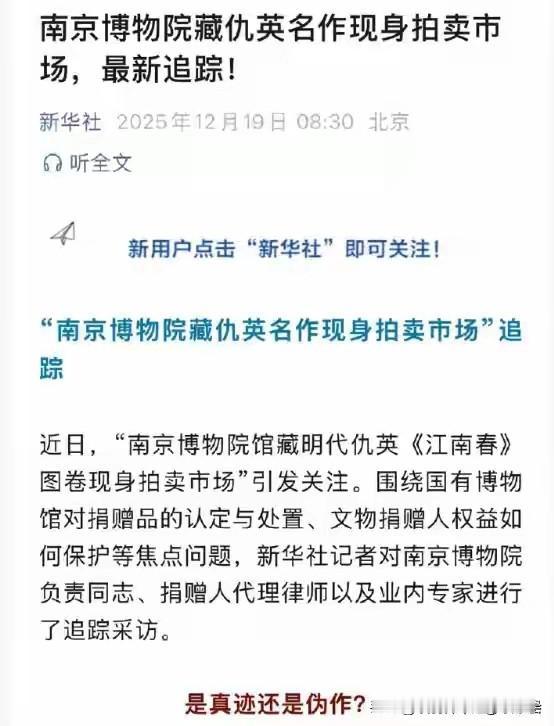 南博正在犯错!8800万国画惊现拍卖行!捐赠南博66年后神秘“消失”,谁动了家族珍藏? 66年前,庞氏家族将137件古画捐给南京博物院,其中明代仇英《江南春》卷惊现2025年拍卖市场,估价8800万。捐赠人后代核查发现,另有4幅画作一并“消失”。 南博回应称,5幅画于60年代被鉴定为“伪作”,90年代已依规处置。但调查显示,其中一幅画疑在2001年以6800元从文物商店卖出,另一幅同名家作品2014年却以230万元拍卖成交。家属从未被告知鉴定与处置情况。 事件暴露博物馆在捐赠品管理、处置程序及尊重捐赠者知情权上的重大缺失。目前官方已介入调查,此事不仅关乎几幅画的去向,更考验着公益捐赠体系的公信力。南京博物馆文物失踪原因可能是什么 古董字画价值 何家英书画回收 仇英独乐园图 仇英画作 仇英画 江南百景园仇英 仇英作品价格 书画估价 南博画作争议 南博古画 南博字画 南博古画谜案 南京博物馆拍卖 苏富比仇国仕 郭怡孮国画回收