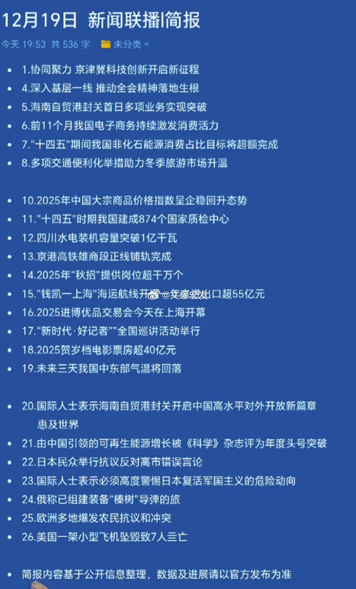 根据12月20日新闻联播内容,以下五大领域值得投资者关注,均体现当前国家政策支持