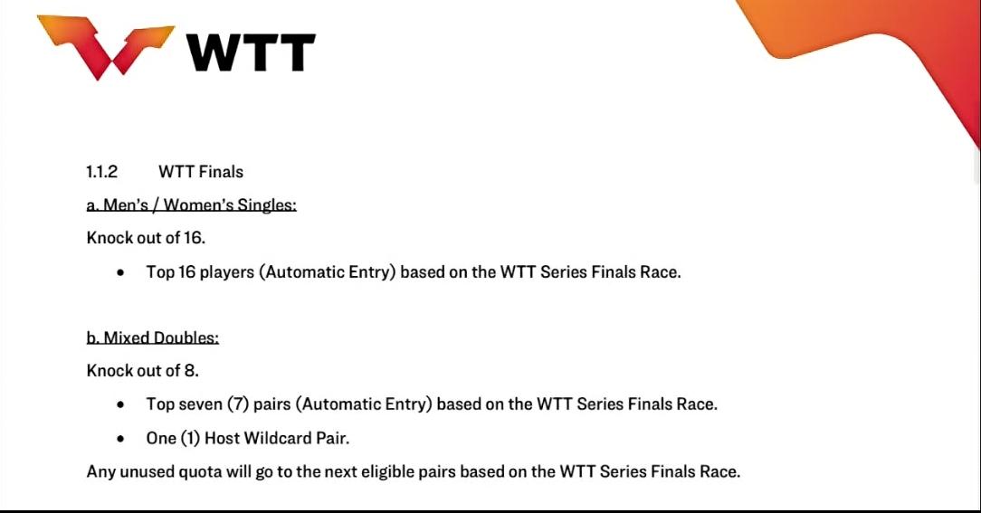 WTT公布2026年竞赛手册。 其中对总决赛混双赛制作了调整,取消了原来的小组赛,改成了直接进行淘汰赛。 这样可以减少混双比赛场次,从原来的15场改成了7场。