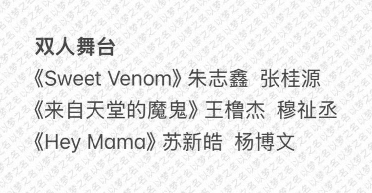 🍉新音跨代双人舞台:苏新皓+杨博文 < Hey Mama > 王橹杰+穆祉丞 橹穆 < 来自天堂的魔鬼 > 朱志鑫+张桂源 < Secret Venom >