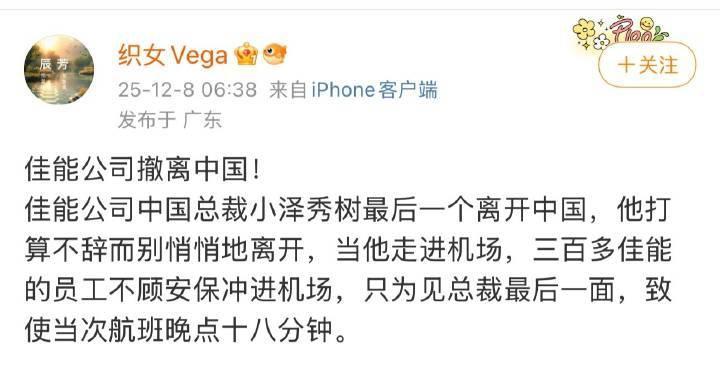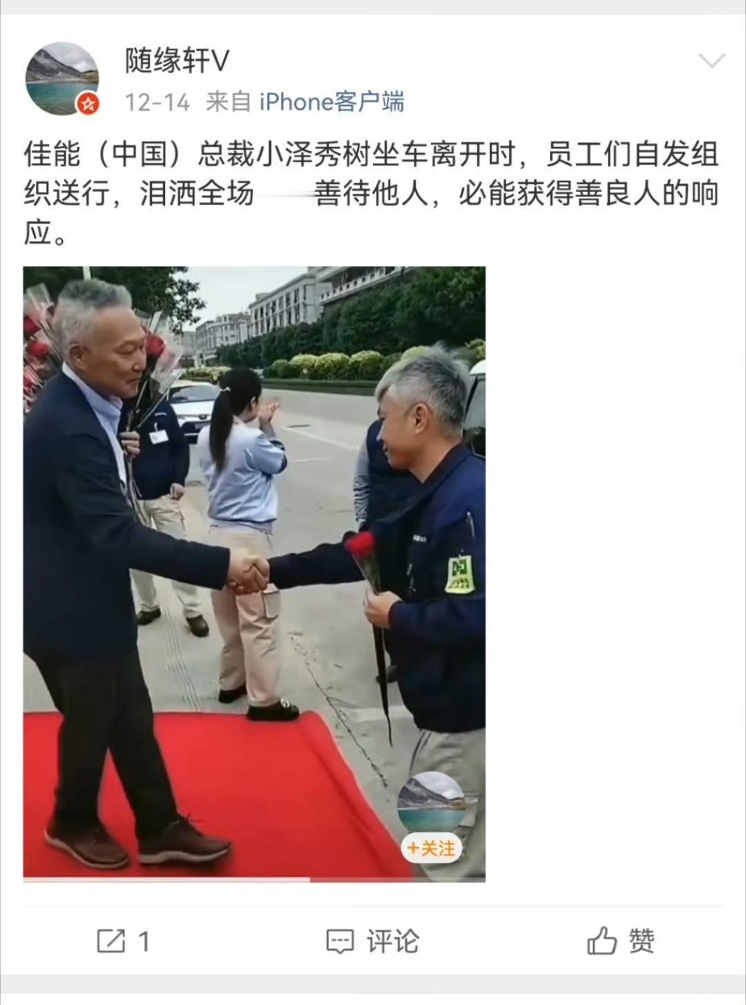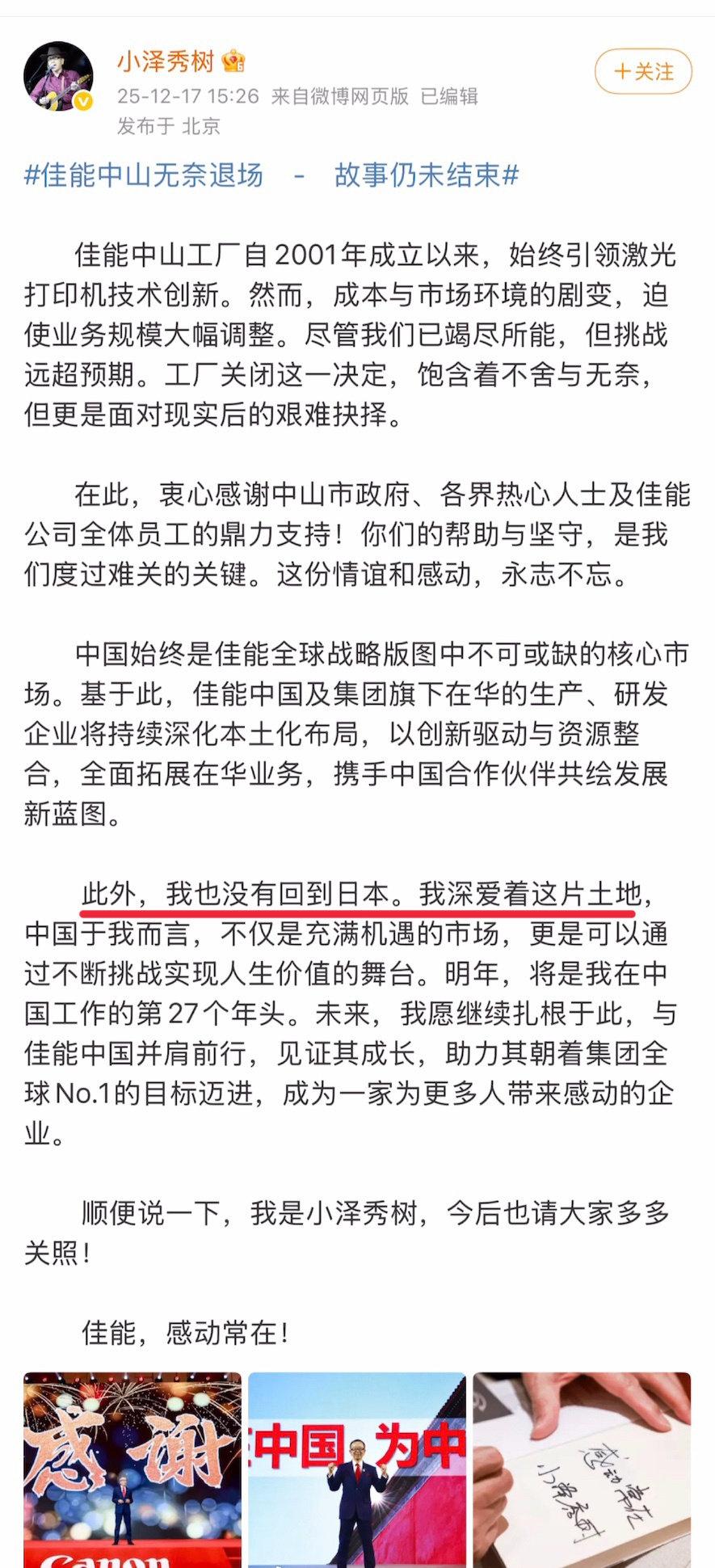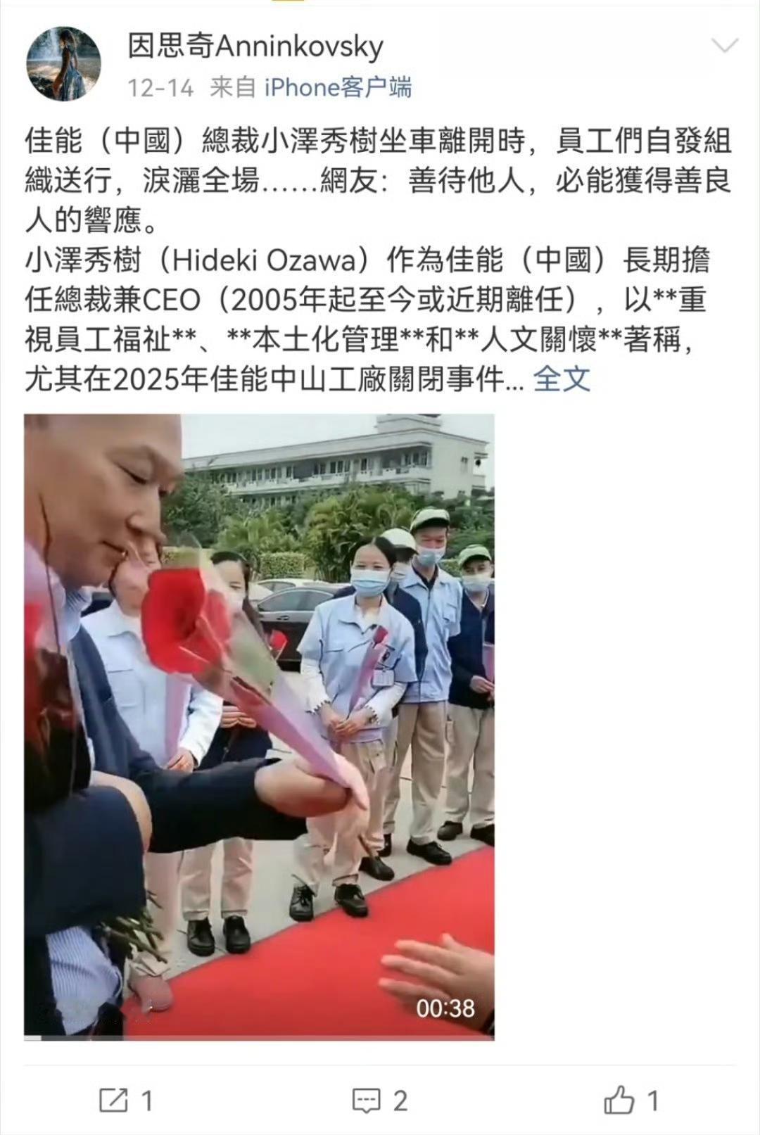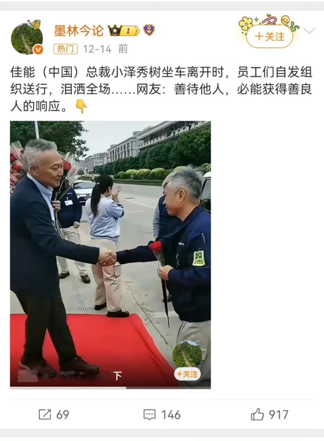 哭错坟了!连文案都一样,啧啧啧。 “三百多员工见老板最后一面”,你把你大哥给哭死了?!这话小泽秀树总裁听了也要后背一凉吧! 急得小泽秀树12月17日自己发文辟谣:我没回到日本。明年,将是我在中国工作的第27个年头。未来,我愿继续扎根于此,与佳能中国并肩前行。 关键是,哭坟的人把人物张冠李戴,所谓的送行现场并不是本人。 佳能工厂在中国还有5座工厂,分布在苏州、大连、深圳等地。这些主要是高技术含量、高附加值的医疗设备和高端办公设备业务。珠海相机工厂和中山打印工厂的退出,是淘汰低利润、劳动密集型的传统组装业务。