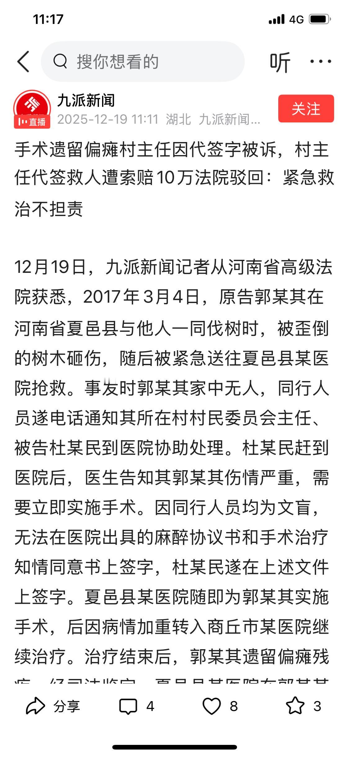 “恩将仇报?”河南夏邑,男子砍树时被歪倒的树砸伤,急需手术治疗,男子家人没在身边,同行人都是文盲,情急之下,村主任帮忙签下手术同意书,谁料,手术过程出了差错,导致男子偏瘫留下残疾,事后,医院赔偿男子12万元,可男子认为都是村主任签字,医院才敢动手术,把村主任告上法庭,索赔10万元。法院判决亮了。 受伤的男子姓郭,那天在伐树时出了意外,树干重重砸在他身上。送到医院,医生一看就说情况危急,必须立刻开刀。可麻烦来了,老郭的家人一时半会赶不到,一块干活的工友大多不识字,对着手术同意书直发愣,谁也担不起这个责任。 时间一分一秒过去,再拖下去可能有生命危险。这时候,村里的杜主任闻讯赶来了。看着老郭痛苦的样子,又看看周围人无助的眼神,他咬了咬牙,抓起笔就在签字栏写下了自己的名字。 “先救人!有啥责任我来担。”杜主任当时就这一个念头。 手术做了,但结果出乎所有人意料,老郭的命保住了,却不幸偏瘫,落下了残疾。事后查明,是手术过程中出现了医疗差错。医院承担了责任,赔了老程十二万六千块钱。 可老郭和家人琢磨来琢磨去,觉得这事的源头就在那份同意书上。“要是当时没人签字,医院是不是就不做手术了?那可能就不会瘫了。”这么一想,他们把杜主任告上了法庭,要他承担十万元的赔偿。 杜主任没想到,自己当时冒着风险、一心想着救急,到头来会站在被告席上。乡里乡亲的议论也多,有人说老郭一家不地道,也有人嘀咕“这字确实不能乱签”。 法院判决认为杜主任签字的行为属于“好意施惠”,是在情况紧急、为了挽救生命迫不得已下的善意帮助。他的签字与老郭最终的损害后果之间,没有法律上的因果关系。老郭的偏瘫,根源在于医院的医疗行为存在问题,而这点已经通过医院赔偿解决了。 法院驳回了老郭的全部诉讼请求。杜主任不用赔这十万块钱。这个判决守住了一条朴素的道理:不能让好人寒了心。在那种紧要关头,站出来的人是需要勇气的,而不是事后被追讨责任。如果今天判杜主任赔钱,那明天再有人遇到类似情况,谁还敢伸手? 法律保护了善意,也厘清了责任。谁出错,谁负责。医院的问题,不能让好心人背锅。 我们都有危难的时候,都希望在关键时刻能有“杜主任”挺身而出。这份善意,是我们社会温暖的底色,需要所有人,尤其是法律,去小心呵护。 各位读者你们怎么看?欢迎在评论区讨论。
