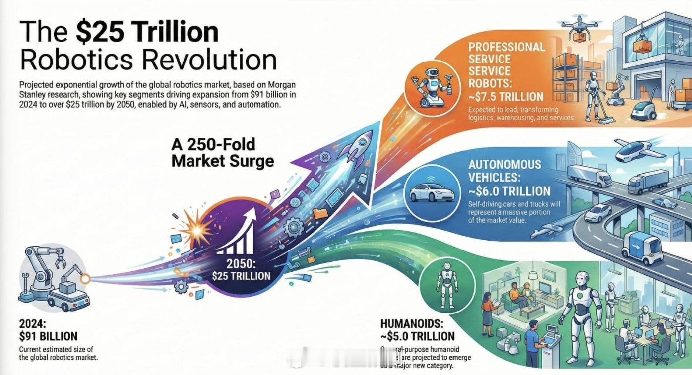 摩根士丹利预测,机器人技术市场规模将从目前的910亿美元增长到2050年的25万亿美元。机器人技术的应用已初见端倪:自2015年以来,全球机器人安装量以约13%的复合年增长率增长