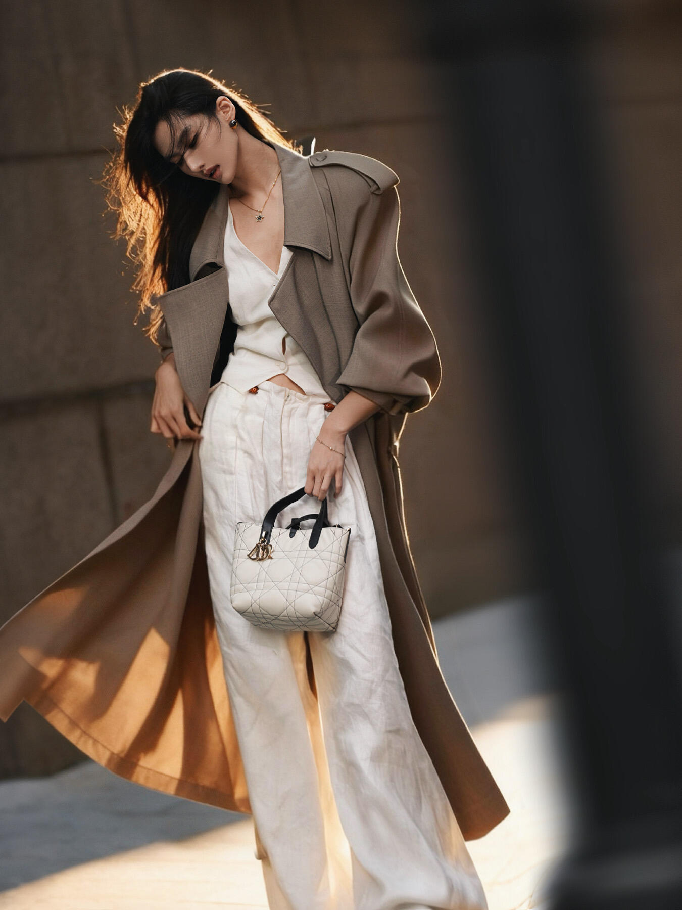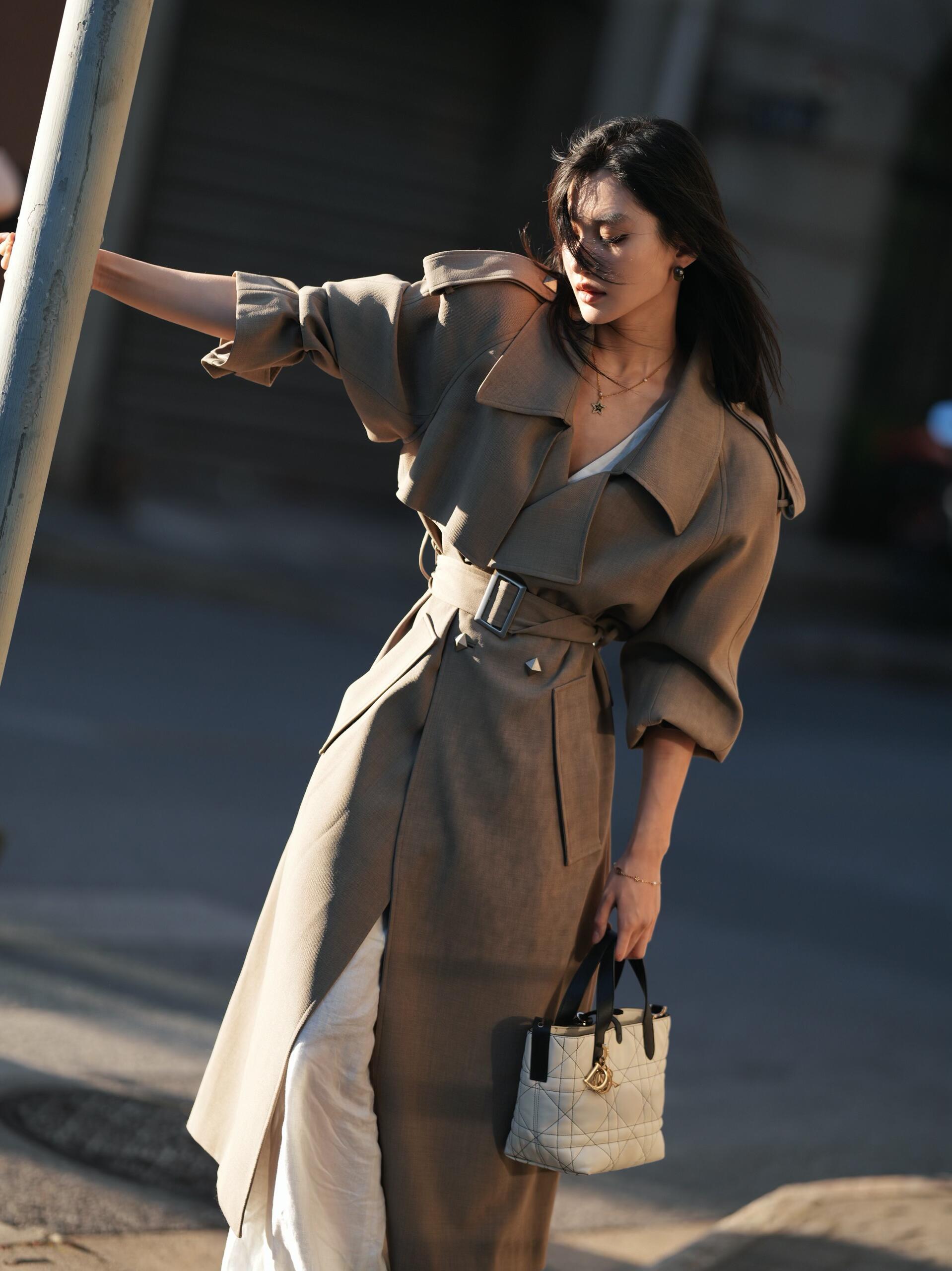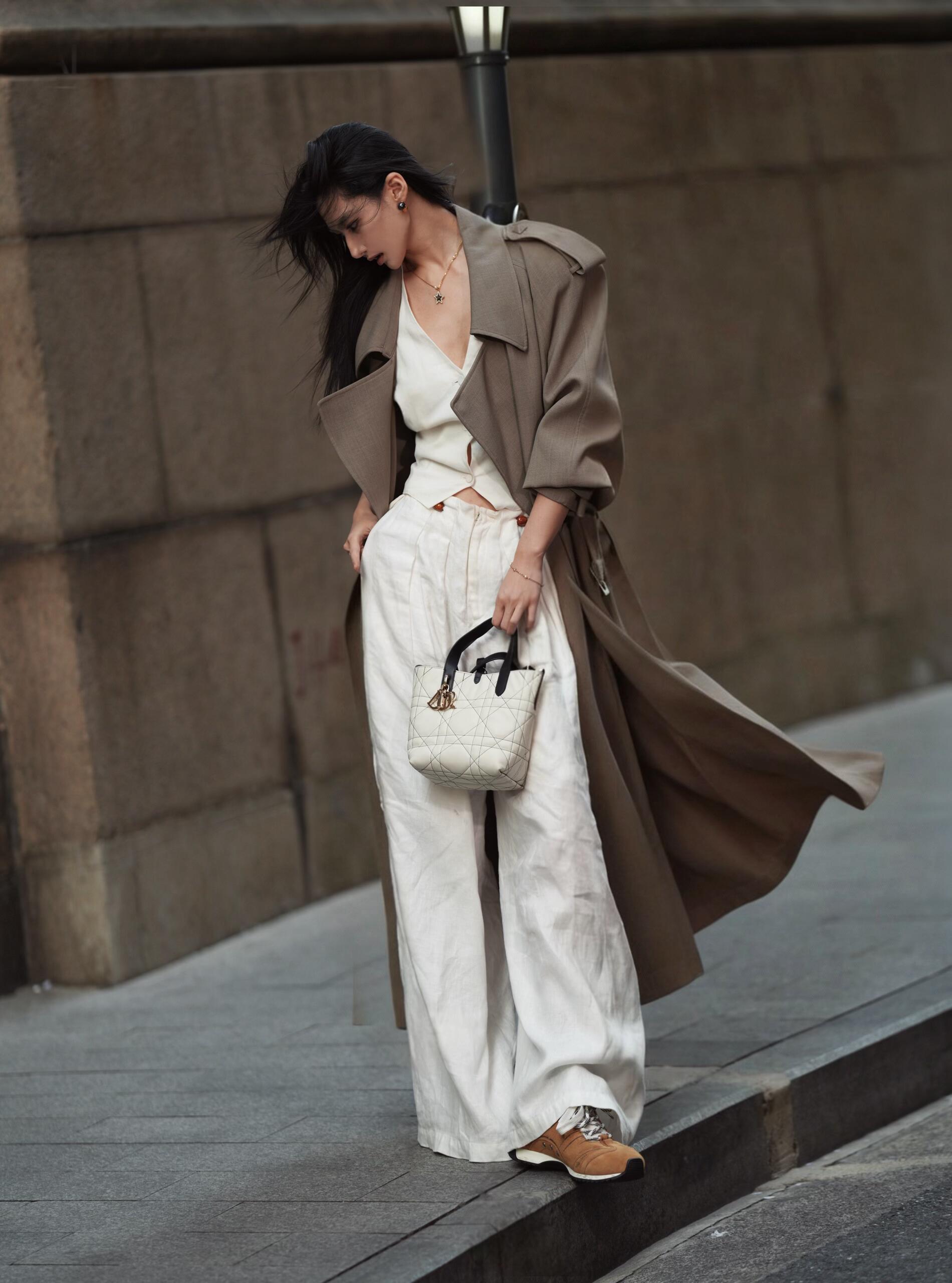 今日look是浅灰绿风衣➕白色棉麻套装!