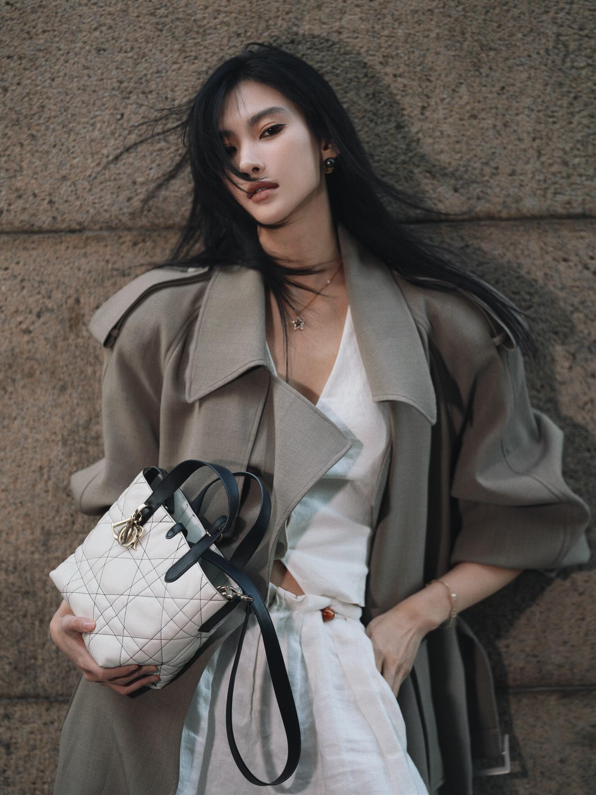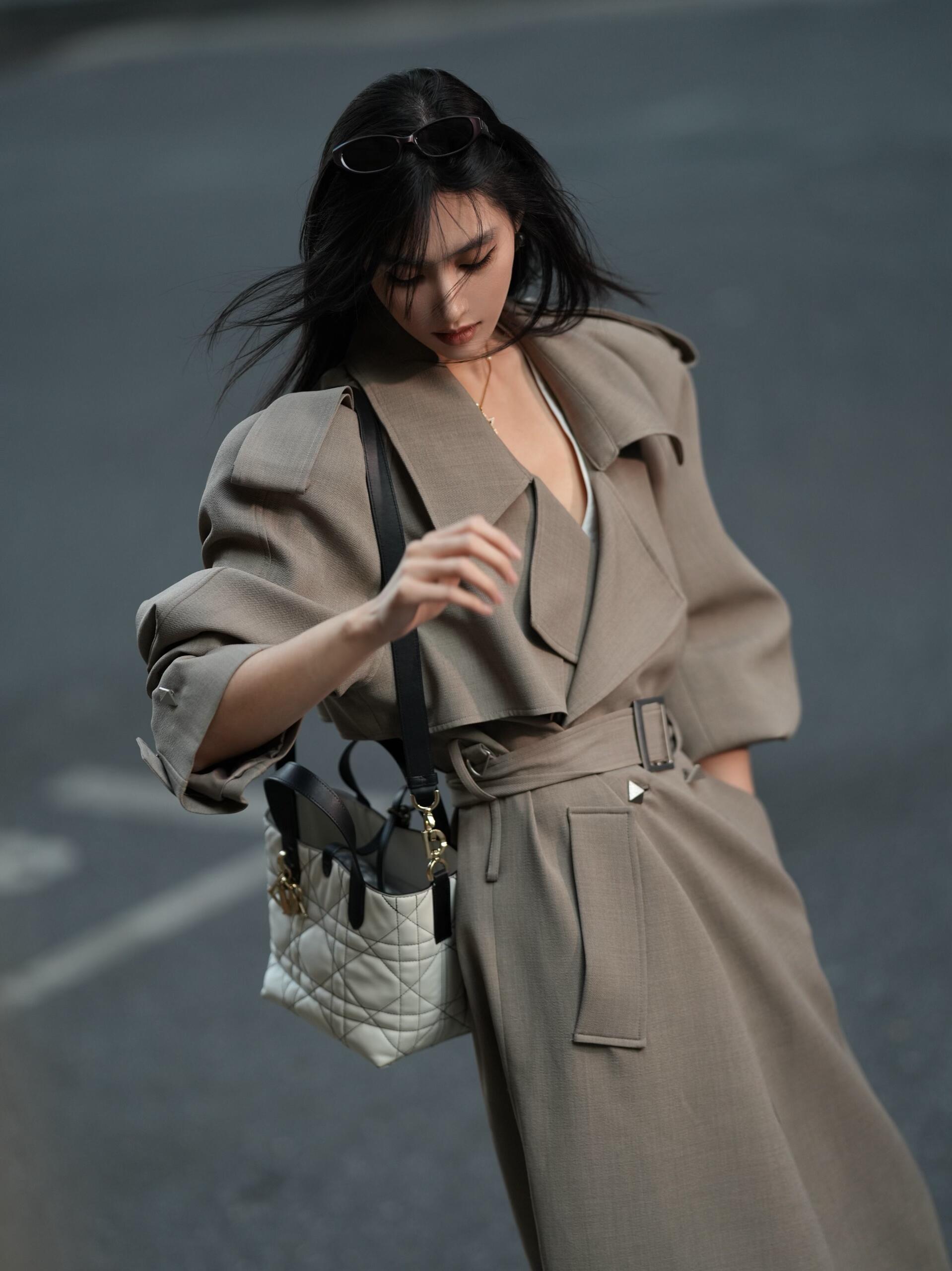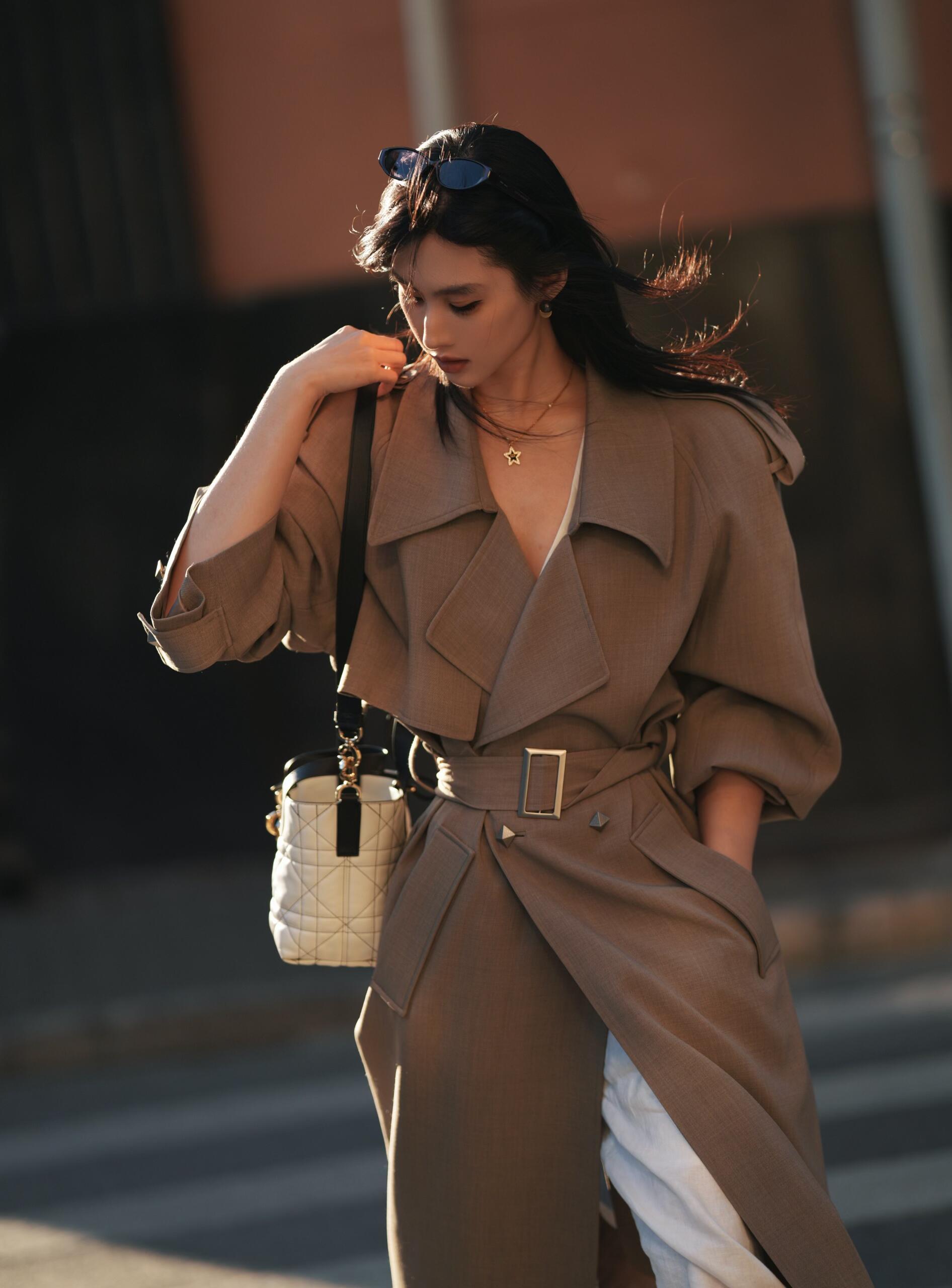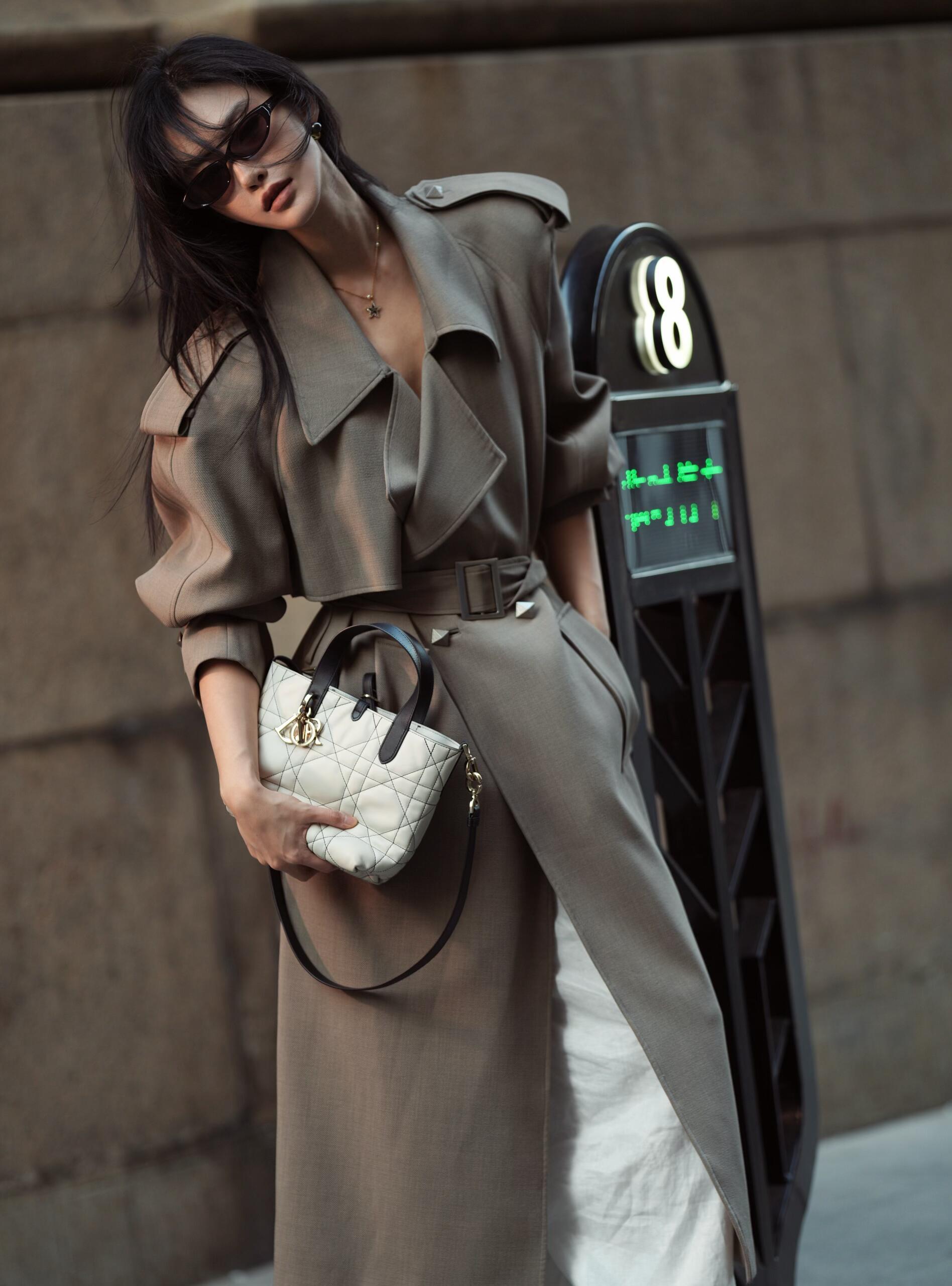 今日look是浅灰绿风衣➕白色棉麻套装!