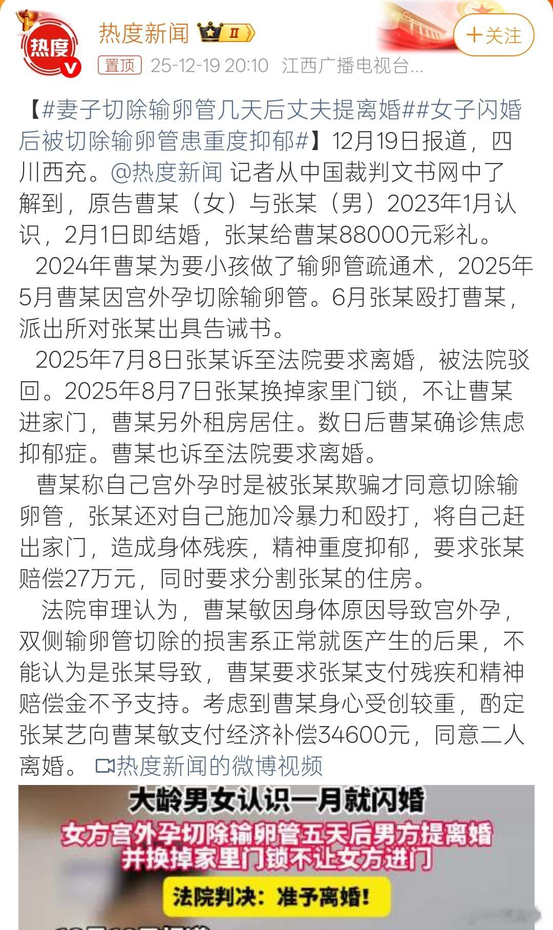 对于这类案件,我的建议是,去裁判文书网上直接看原文,不要看媒体报道。根据裁判文书,女方的诉讼请求起初有五:第一,判决男方返还其2万元婚前财产。第二,依法追究男方遗弃罪的责任,并支付婚姻损害赔偿10万元。第三,判令男方赔偿残疾赔偿金25万,精神损害赔偿金2万。第四,判令男方支付家暴产生的检查费591.86元。第五,依法分割某小区估值为40万的房产,支持女方分得10万。庭审中,女方主动放弃了第2条和第5条,但坚持余下3条。女方的理由是,①2万元系其婚前财产,借给男方偿还债务,离婚时应当返还,②男方结婚时曾承诺照顾女方一辈子,但在女方怀孕后不管不顾,甚至欺骗女方切除健康输卵管,导致女方残疾,并在女方做完切除手术后5天即提出离婚,并殴打女方,构成虐待,③男方女方宫外孕,做输卵管切除手术后代女方签字,导致女方丧失自然生育能力,今后再生育成本增加,④男方对女方实施家暴,警方为此还出具了家暴告诫书,男方应当承担女方的医疗费用。法院一审认为,①女方承认对手术知情并同意做手术,故此手术并未违背其意愿,男方虽代其在手术同意书上签字,不能以此认定男方侵犯其权益,故对女方提出的赔偿请求不予支持,②由于女方术后诊断出抑郁焦虑症状,男方应给予适当经济补偿,同时鉴于其做手术所遭受的痛苦和身体伤害,目的是为培育试管婴儿做准备,故酌定男方给予3万元的经济补偿,③对于女方主张的精神损失费,因其受到的暴力和伤害程度较轻,不予支持,④2025年8月,双方虽因纠纷再次发生矛盾,但由于男方起诉离婚的诉求被拒,双方夫妻关系尚存,男方不让女方回家的行为欠妥,故女方支出的房租,应由男方补助一半,即4600元。至于女方主张的2万元系其婚前财产,由于双方举证不能,故法院不予支持。综上,法院一审判决男方给予女方经济补偿3.46万,女方其余诉求不予支持。二审法院维持先前判决。妻子切除输卵管几天后丈夫提离婚女子闪婚后被切除输卵管患重度抑郁实务案例看一看