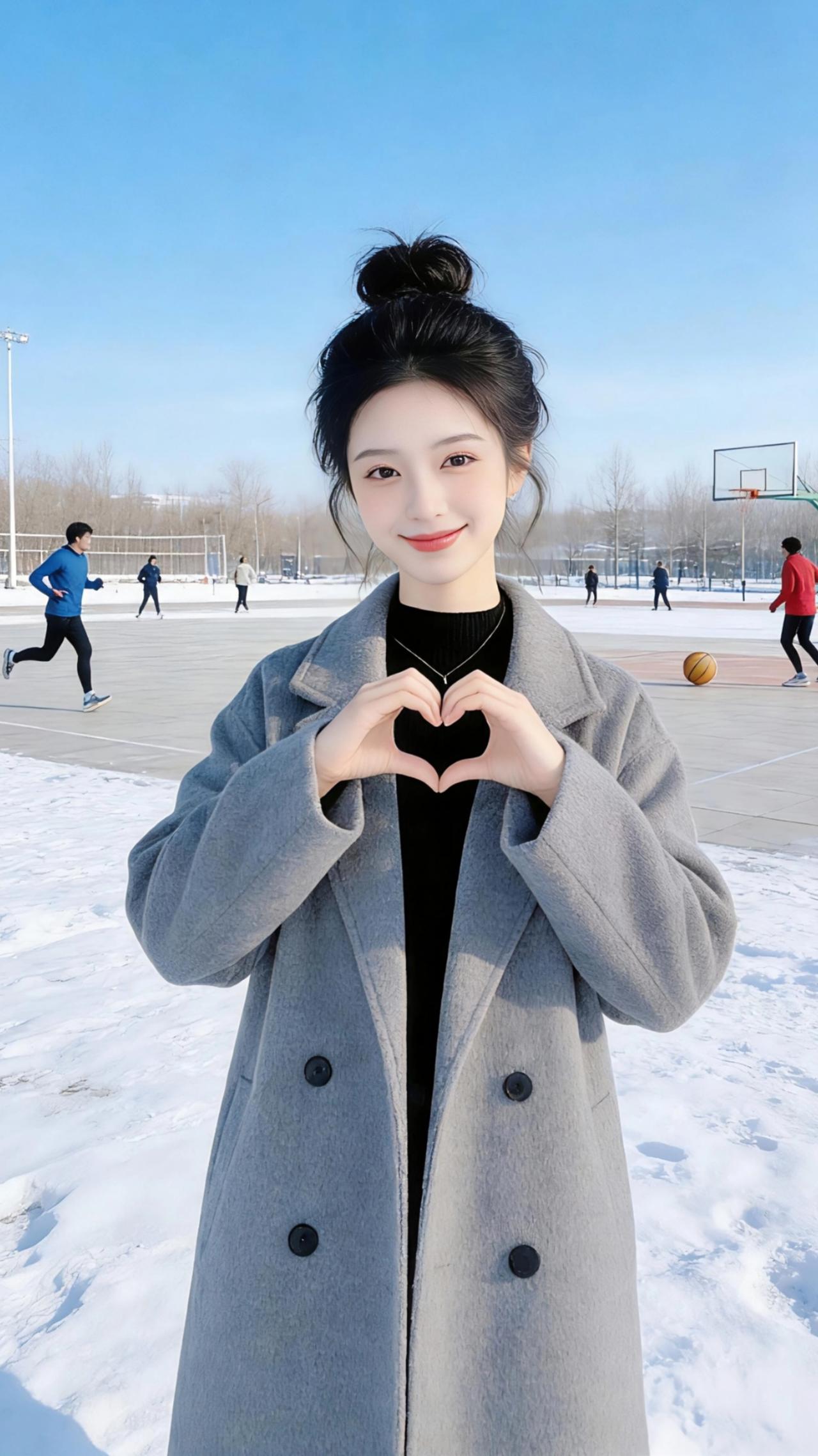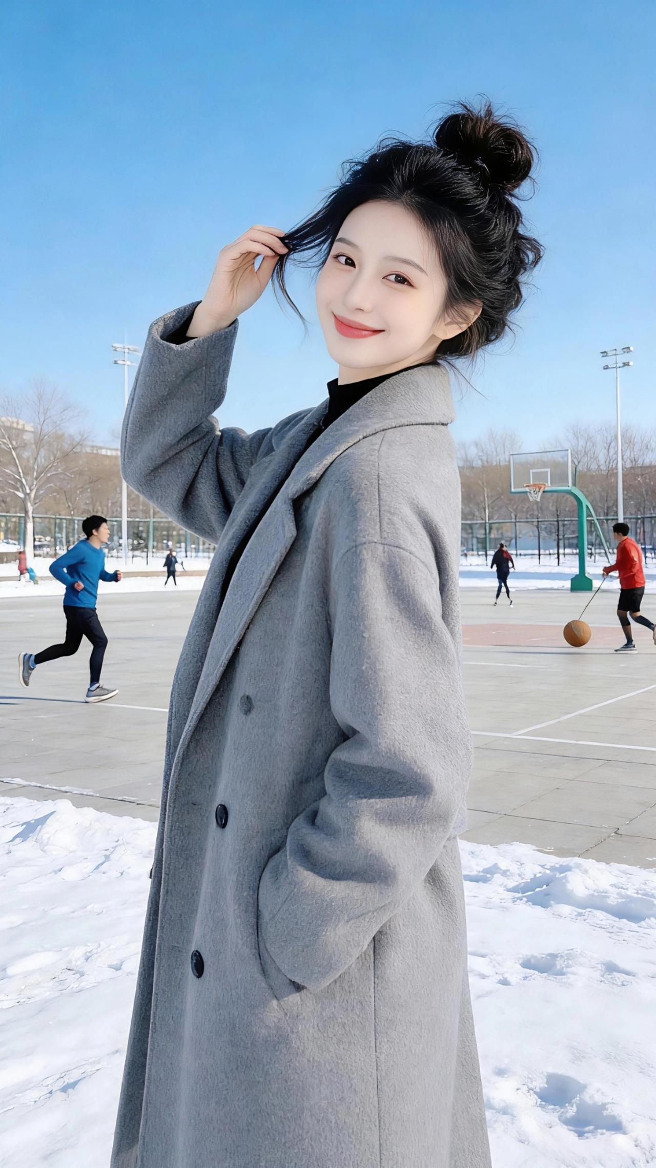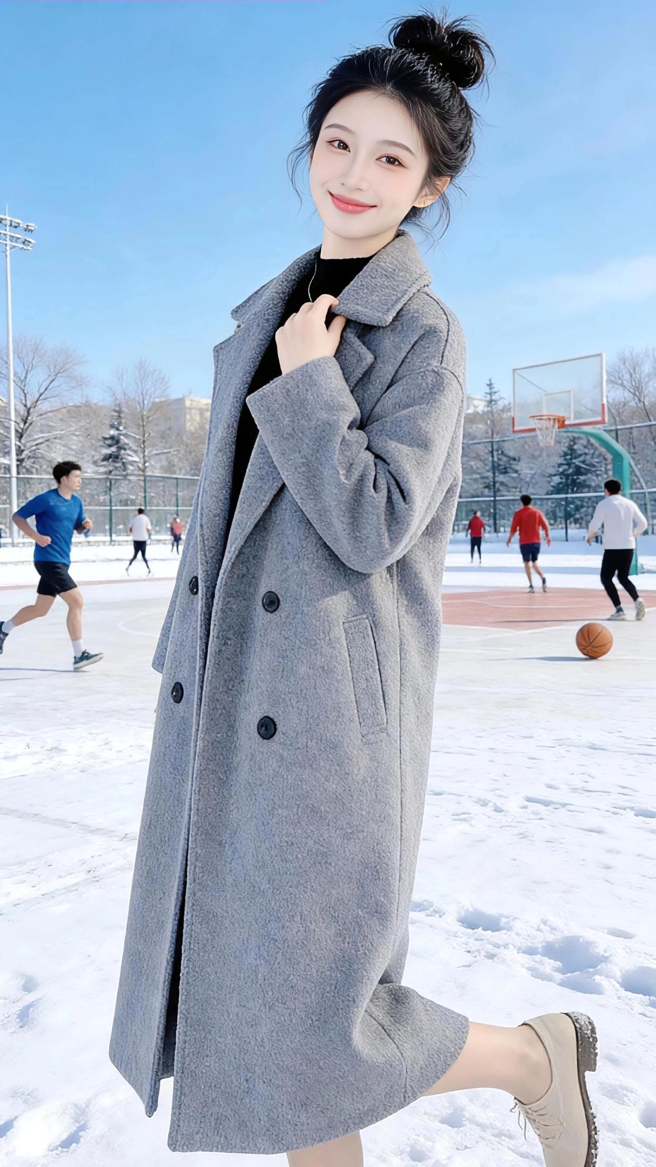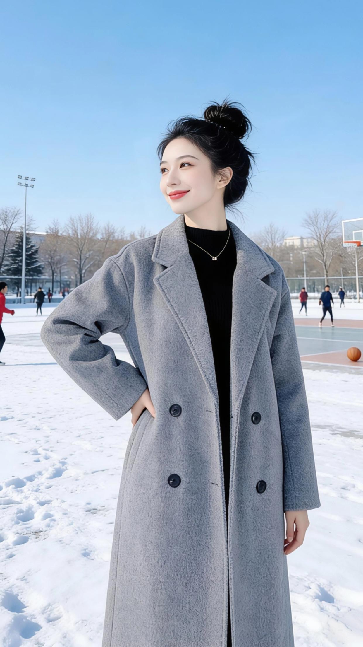 雪日球场的温柔序章 冬日的风裹着碎雪掠过球场,天蓝得像一块刚擦拭过的冰晶,晃得人眼睫都轻颤。我裹着灰色大衣站在雪地里,绒面的布料接住零星飘落的雪粒,又被风轻轻拂去。 身后的球场是另一种热闹,篮球撞击地面的声响混着奔跑的脚步声,穿着短袖的身影在雪色里跃动,像一团团烧得热烈的火,和这凛冽的冬撞出奇妙的反差。我抬手拢了拢大衣领口,指尖触到温热的针织内搭,暖意从脖颈漫开。 丸子头的碎发被风撩起,我伸手勾住那缕调皮的发丝,转身时看见篮球架的影子斜斜映在雪地上,雪层被踩出深浅不一的脚印,像给纯白的画布缀上了生动的纹路。抬手比心的瞬间,阳光落进眼底,碎雪在光里闪着细亮的光,仿佛把整个冬天的温柔都揉进了这一刻。 手插进口袋时,大衣的布料贴着掌心,暖意融融。侧头望向球场外的枯树,枝桠上积着的雪像蓬松的棉絮,风一吹,便簌簌地落,和球场里的喧嚣相映,倒成了冬日里最鲜活的景致。原来寒冬从不是单调的冷,雪色里藏着的热闹,大衣裹着的温暖,还有风里飘来的笑闹声,都是冬天独有的温柔序章。 高级感穿搭 大衣外套冬日穿搭一周不重样 冬季穿搭
