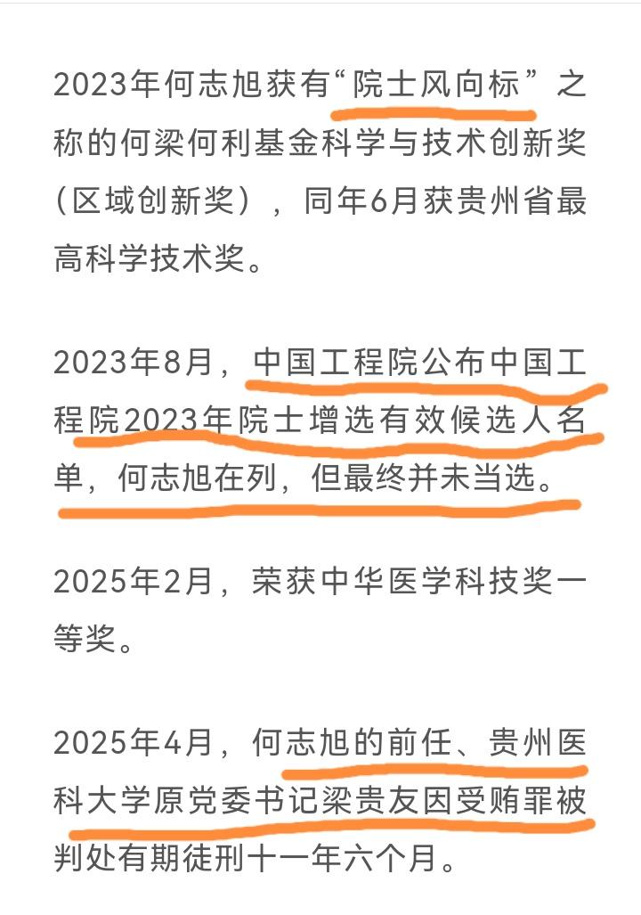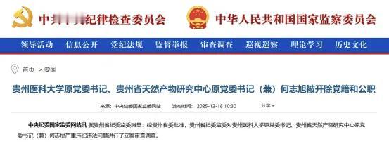 院士候选人被双开!好家伙,昨天还是风光无限的院士候选人,今天就上了中纪委官网的“曝光台”(详见附图)。 这反转比实验数据造假还猛——贵州医科大学原党委书记何志旭,用自己的职业生涯上演了一出“学术再高,也怕纪委”的现实剧,院士梦彻底碎在了双开通报里。 这份通报简直像篇学术范文,每个词都值得细细品: · “丧失理想信念,背弃初心使命”——好家伙,直接给灵魂做了个“转基因手术”; · “对抗组织审查”——这简直是把纪委当学术对手来 battle; · “靠医吃医”——纯纯把公立医院当成自家诊所了; · “跑官要官”——组织程序愣是被他混成菜市场讨价还价。 最绝的是“德不配位”这四个字,精准得像手术刀——原来选院士不光看论文厚度,更得看品德秤砣! 工程院院士本该推动科技进步,这位倒好,专精“权力变现技术”,在廉洁底线上疯狂“钻洞”。 院士增选本该是学术净土,却总有人想拿着权力插队券混进去。幸好纪检监察环节实行“双盲评审”——管你是什么大佬、候选人,有问题直接一票否决! 是院士更重要,还是品德底线不可破? 来说说你的看法吧!撤销的院士 贵州籍院士