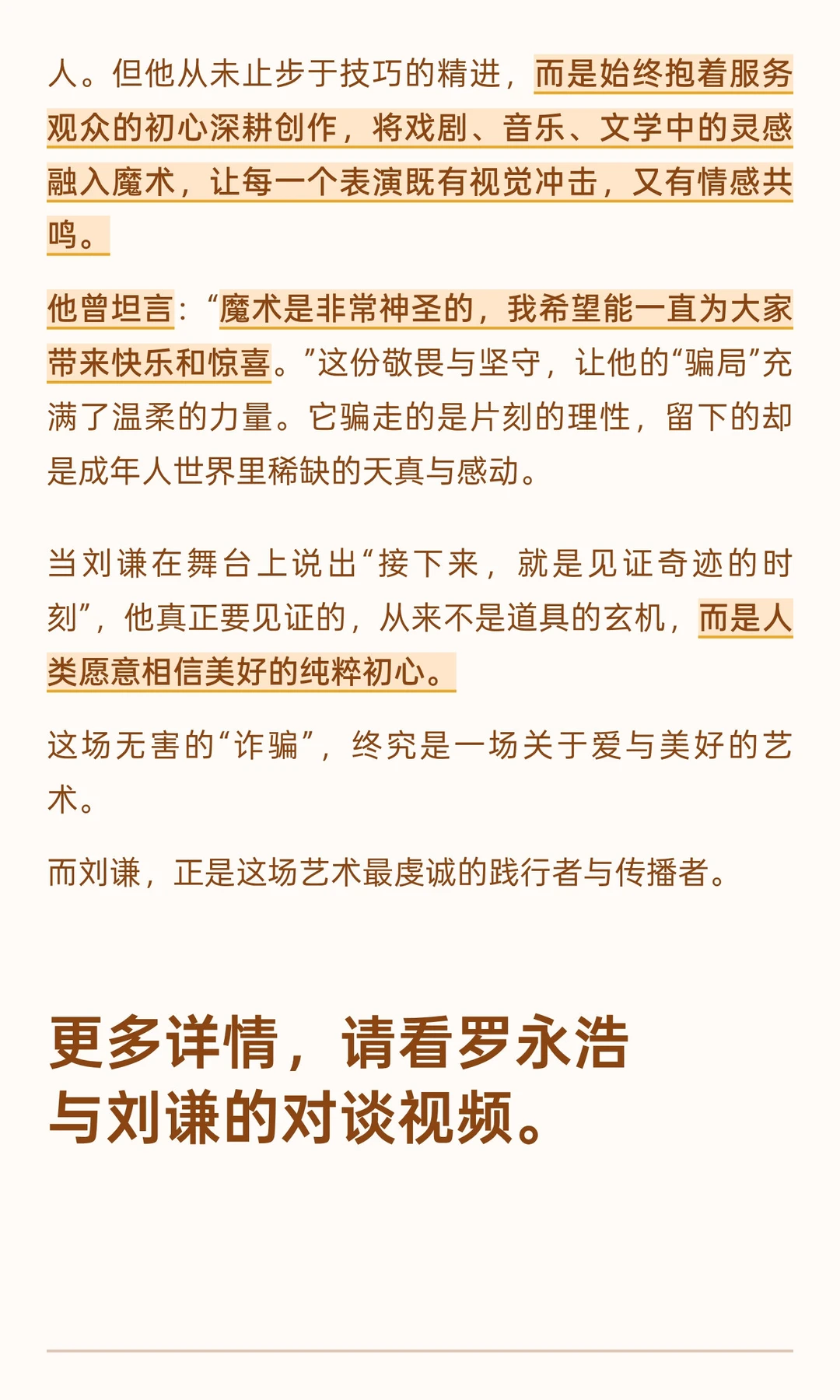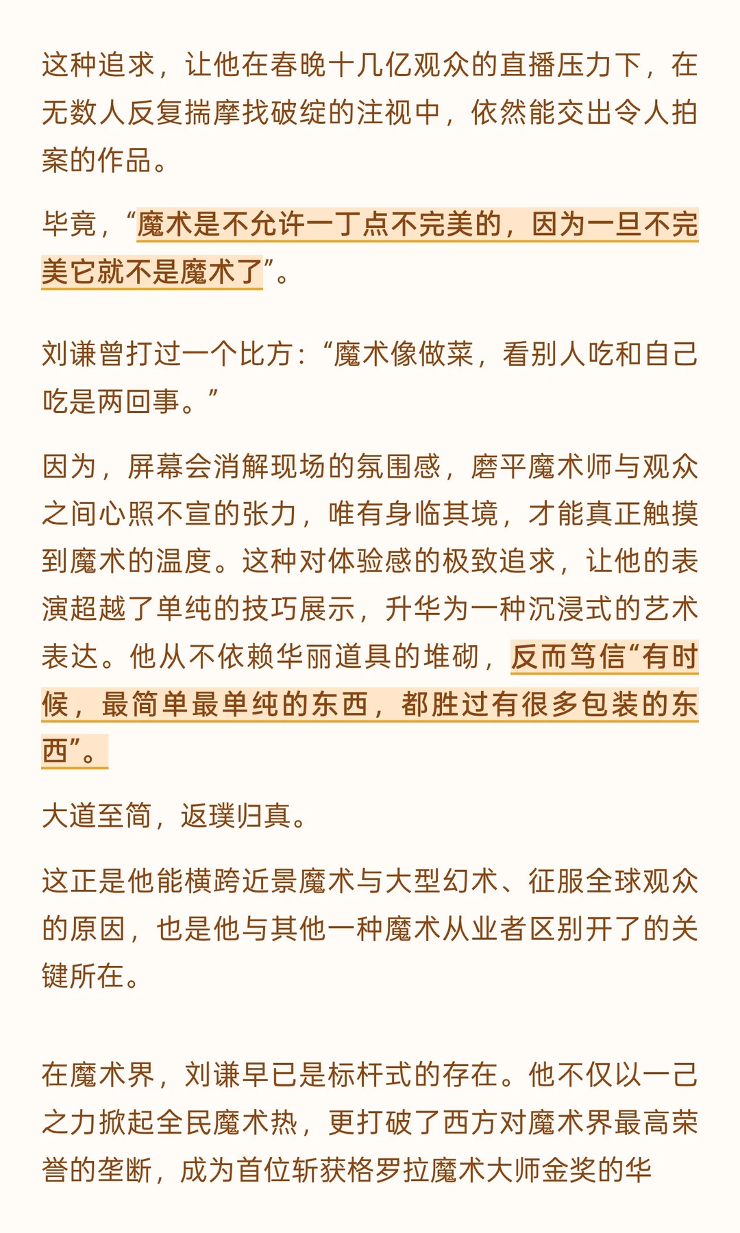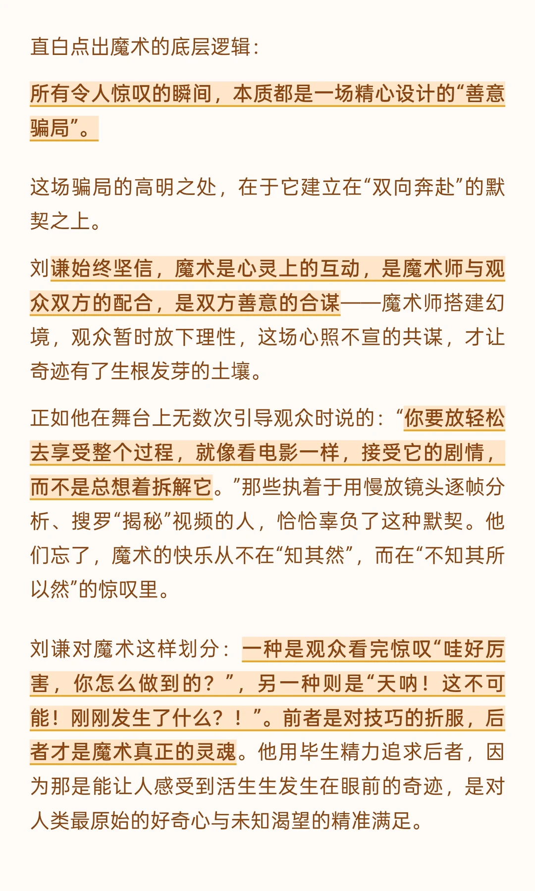 他强调魔术的本质是“善意骗局”,通过精心设计让观众暂时放下理性,感受奇迹的震撼。