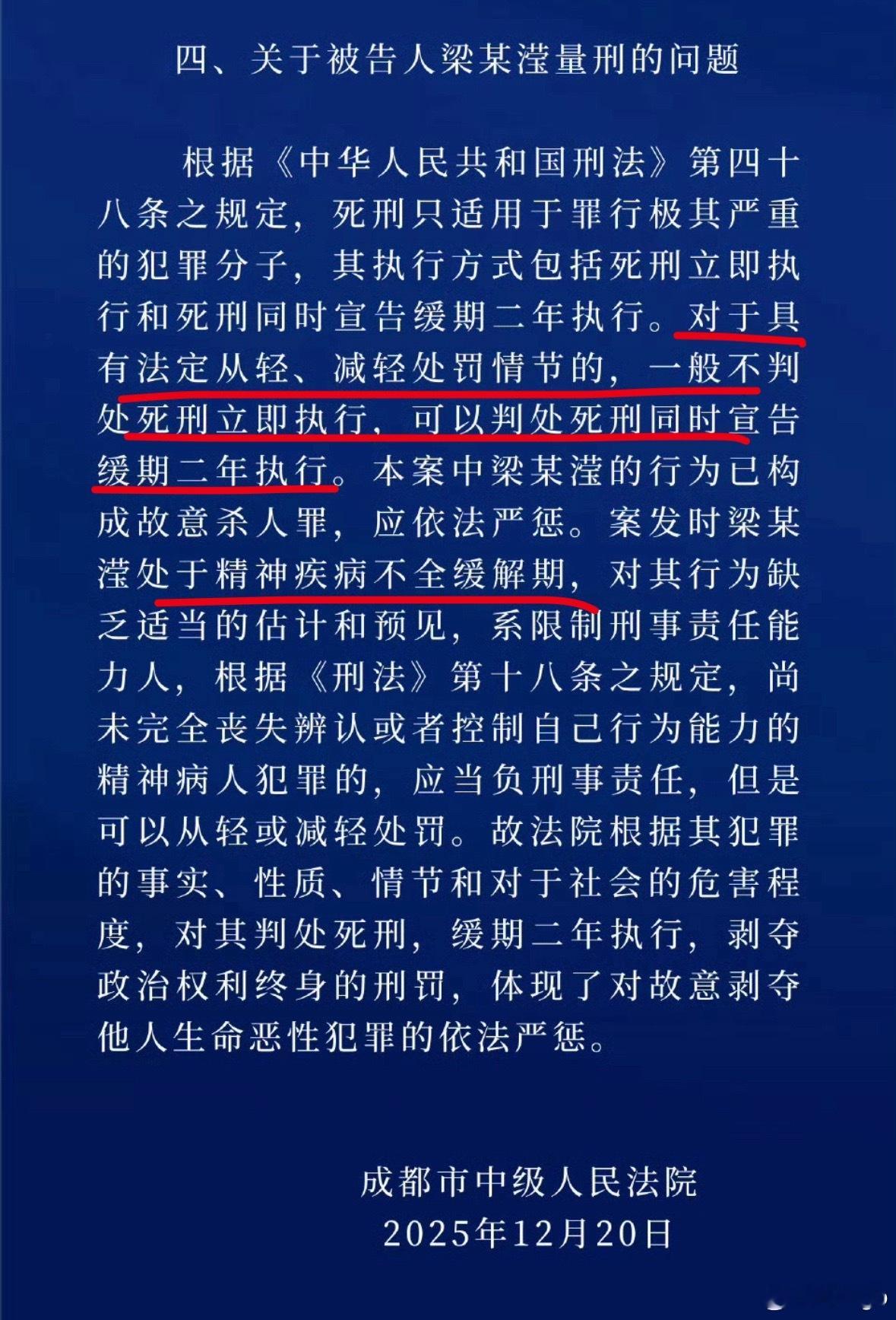 成都中院回应梁某滢被判死缓这个案子可以和前两天精神分裂杀人一起看。那个案子一审死缓,二审改判死刑。这个案子一审死刑,看看二审咋判吧。成都女子家门口遇害案被告一审死缓