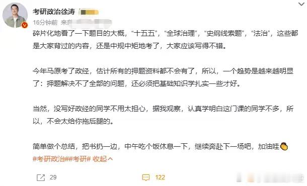 我勒个模板大胜利啊,这下明年都要去背模板了。为什么又搞这么难,看大家都是非常不开心的,但是我希望大家先忘掉这些不开心,难都是一起难得,大部分同学还是背的肖四,所以整理好心态面对下一场考试。虽然大部分传统押题的老师翻车了,但我看徐涛老师今年押的很准,真不戳。曲艺老师更不用说了,模板今年是真无敌了,27的同学我也是比较建议大家去背模板了,管他反押不反押,上去就是套,是真的好用。前期跟徐涛老师打好基础(很重要!),做做基础选择题,学学选择题技巧,最后做各个模拟卷的选择题部分,把选择题搞定。大概十月左右开始背曲艺的模板,搭配一下徐涛的三套卷,这样大题也没啥问题了。曲艺模板26考研政治结束徐涛发文考研政治