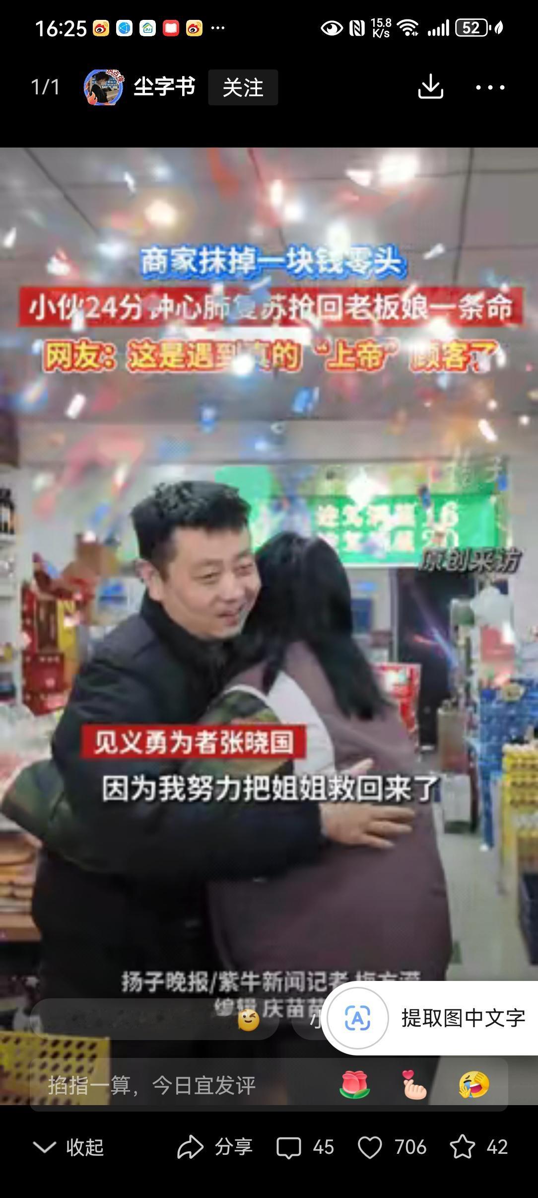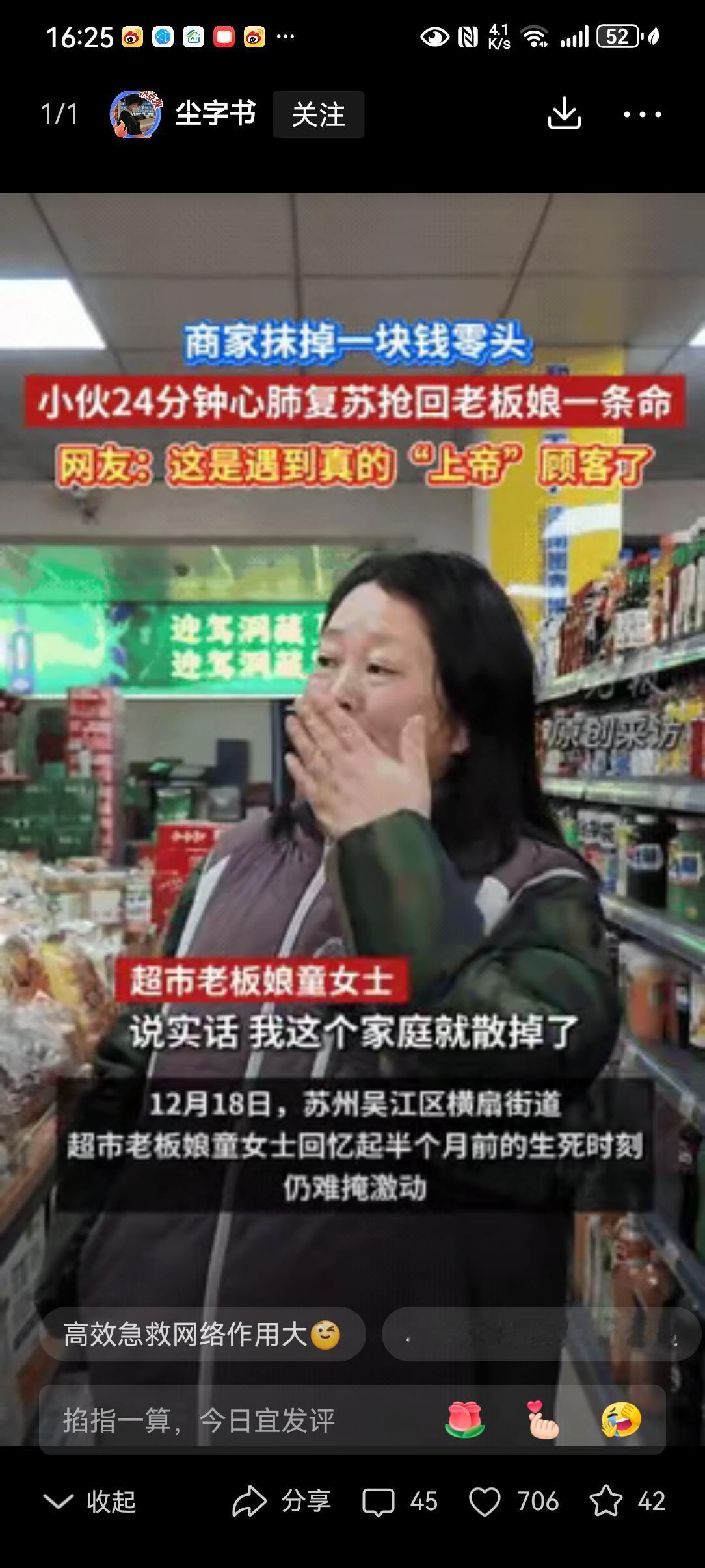 “捡回一条命!”江苏苏州,小伙进店买点东西,结账的时候,老板娘还说“零头抹了呗”,结果刚说完,老板娘突然身子一软,整个人直接瘫倒,头“砰”的一声就磕在了货柜上,接着软绵绵地滑到地上,没了动静。 小伙愣了几秒,随即冲过去呼喊,可老板娘早已没了回应,店里也不见她的家人。他来不及多想,指尖哆嗦着拨通了120,电话那头的调度员却异常镇定。 没有慌乱的催促,只有清晰的指令:“跪下,找准位置,开始按压!”小伙咬着牙,按照“每秒两次、下压五厘米”的要求,一下下摁在老板娘胸口。 24分钟,不算长,却足够让手臂酸痛到发抖,足够让旁观者心惊胆战。他没停,直到救护车的鸣笛声刺破街巷,医生冲进来接手的那一刻。 后来才知晓,老板娘常年被高血压、糖尿病缠扰,却总抱着“扛扛就过去”的侥幸,那天突然的心跳骤停,险些酿成悲剧。医生直言,少了这24分钟的有效按压,人恐怕早就救不回来了。 这小伙的沉着,实在难得。换作旁人,怕是早被吓慌了神,可他偏偏能把刷手机时瞥见的急救科普,变成实打实的救命动作。 更该提的是120调度员的远程指导——看不见的“指挥官”,用冷静的声音撑起一场生死营救,让小小的超市成了守护生命的阵地。 这哪里是偶然?是社会急救网络织就的安全网,是普通人心里记着的那点急救常识,凑成了这场“捡回一条命”的奇迹。 总有人说“学急救没用”,可真到了生死关头,那些看似不起眼的知识,就是拽住生命的最后一根绳子。多懂一点,或许就能多救一人,这话从来不是空话。 别等意外找上门才后悔,花点功夫学些急救门道,既是护着自己,也是给身边人留份生的底气。毕竟,生命面前,从来没有“下次再说”。