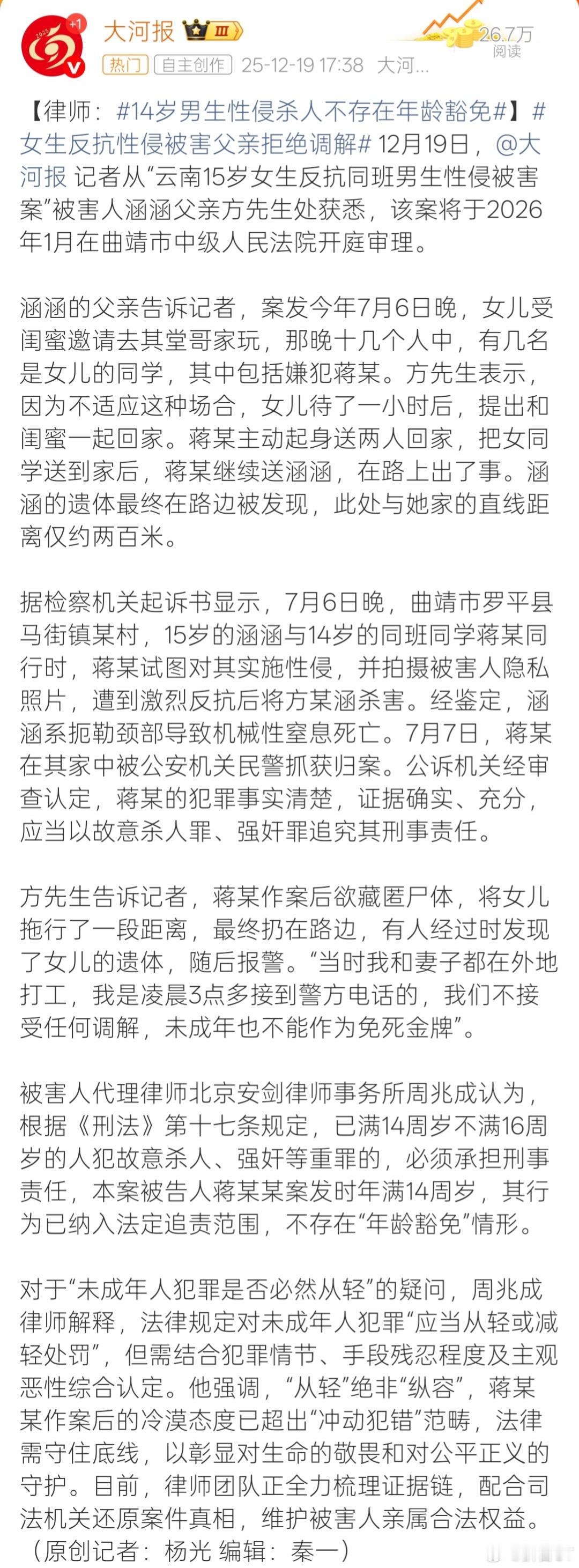 虽然还没宣判,但这案子最后的判决结果很清晰。大概率是以故意杀人等罪名,判处被告无期徒刑。刑法第17条第二款规定,已满14周岁但不满16周岁的人,犯故意杀人等八大罪,应当负刑事责任。第49条规定,犯罪时不满18周岁的人和审判时怀孕的妇女,不适用死刑。死刑包括死缓和死立执。综合来看,本案被告事发时已满14周岁,但依旧是未成年,因此,本案最有可能的刑期就是无期徒刑,哪怕死者家属拒绝调解,也不可能判处死刑(立即执行)。因为,未成年人的身份就是免死金牌。14岁男生性侵杀人不存在年龄豁免实务案例看一看