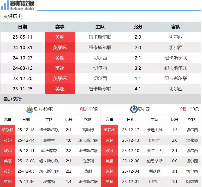 纽卡斯尔vs切尔西前瞻:喜鹊主场龙 蓝军惧怕肉搏战 喜鹊无惧蓝军北京时间12月20日晚上20:30,英超第17轮,纽卡斯尔主场迎战切尔西。纽卡斯尔vs切尔西,比赛看点如下:第一:两队情况!英超16轮战罢,纽卡斯尔6胜4平6负积22分排名第十二,切尔西8胜4平4负积28分排名第四。上轮英超,纽卡斯尔客场0-1不敌桑德兰,联赛4轮不败遭终结,周中联赛杯主场2-1击败富勒姆;切尔西主场2-0击败埃弗顿,帕尔默复出首球,球队终结了各项赛事4场不胜,周中联赛杯客场3-1击败卡迪夫城。第二:喜鹊主场龙,蓝军惧怕肉搏战,喜鹊无惧蓝军!纽卡斯尔是一支非常明显的主场龙球队,身体对抗很大,甚至可以说踢得较“脏”,而切尔西喜欢踢技术流球队,而惧怕打肉搏战、身体对抗强的球队。中场方面,凯塞多复出,两对南美后腰对决,吉马良斯PK凯塞多,会是比赛的热点画面。综上所述,切尔西肯定会在纽卡斯尔主场遭遇阻击,很难全取三分,纽卡斯尔主场无惧切尔西,此役看好纽卡斯尔主场不败。双方近6次交手,纽卡斯尔3胜1平2负,略占上风。双方伤停情况:纽卡斯尔有特里皮尔、奥苏拉、克拉夫特、博特曼、伯恩、拉塞尔斯、波普(疑)、利夫拉门托(疑);切尔西有埃斯特旺、埃苏戈、拉维亚、科尔维尔、德拉普。