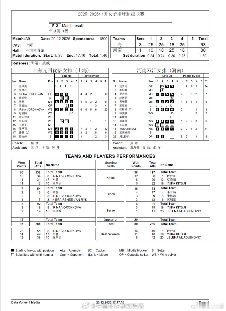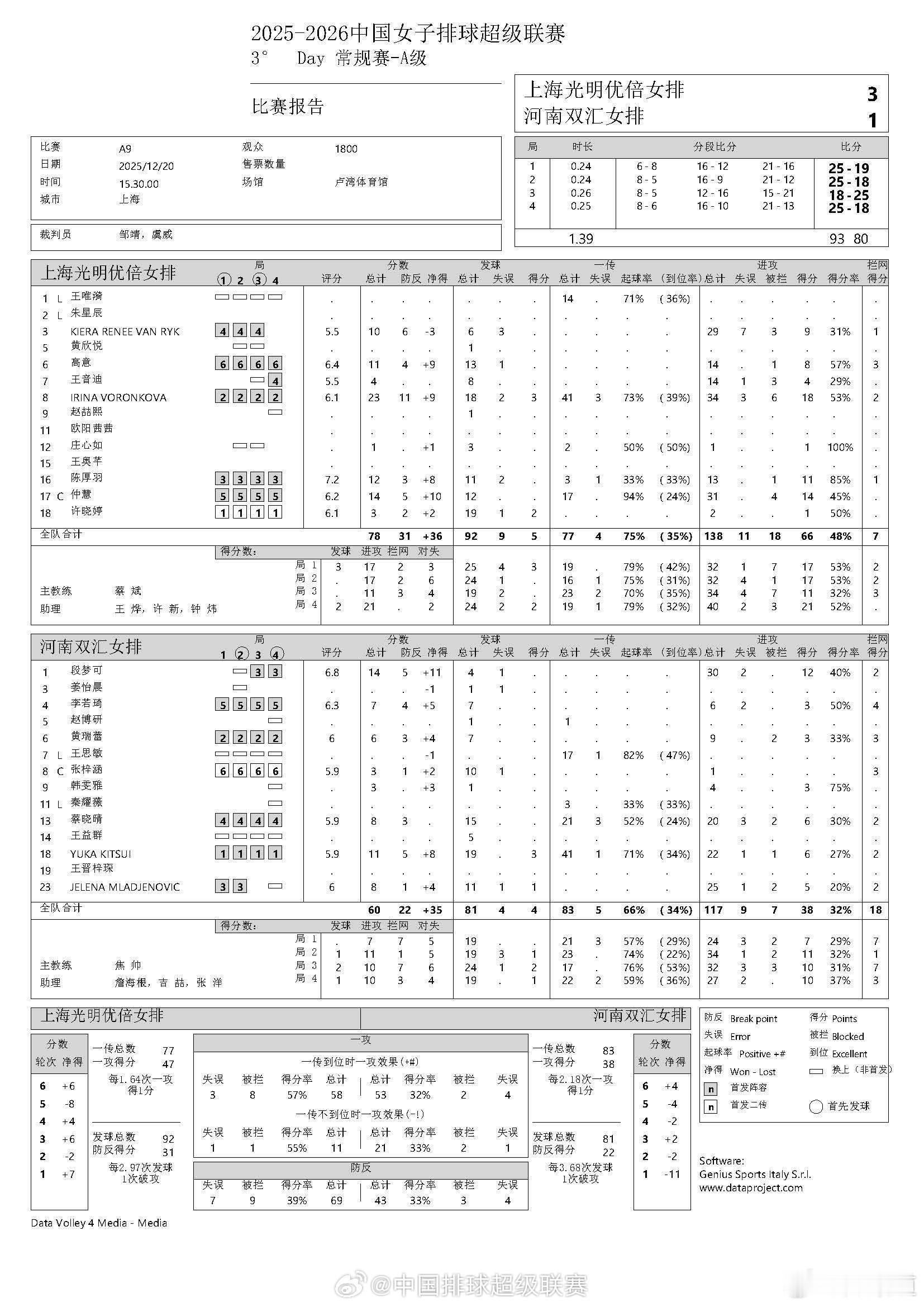 2025-2026中国排球超级联赛排超联赛上海光明优倍 3-1(25-19/25-18/18-25/25-18) 河南双汇技术统计 上海光明优倍–河南双汇进攻:66-38;拦网:7-18;发球:5-4;自失:20-15沃隆科娃23分 34扣18中3失误6被拦、2拦3发;仲慧14分 31扣14中;陈厚羽12分 13扣11中1拦;高意11分 14扣8中3拦;范赖克10分 29扣9中1拦;王音迪4分 14扣4中;许晓婷3分 2扣1中2发;庄心如1分 1扣1中段梦可14分 30扣12中2拦;橘井友香11分 22扣6中2拦3发;蔡晓晴8分 20扣6中2拦;姆拉杰诺维奇8分 25扣5中2拦1发;李若琦7分 6扣3中4拦;黄瑞蕾6分 9扣3中3拦;张梓涵3分 1扣0中3拦;韩雯雅3分 4扣3中