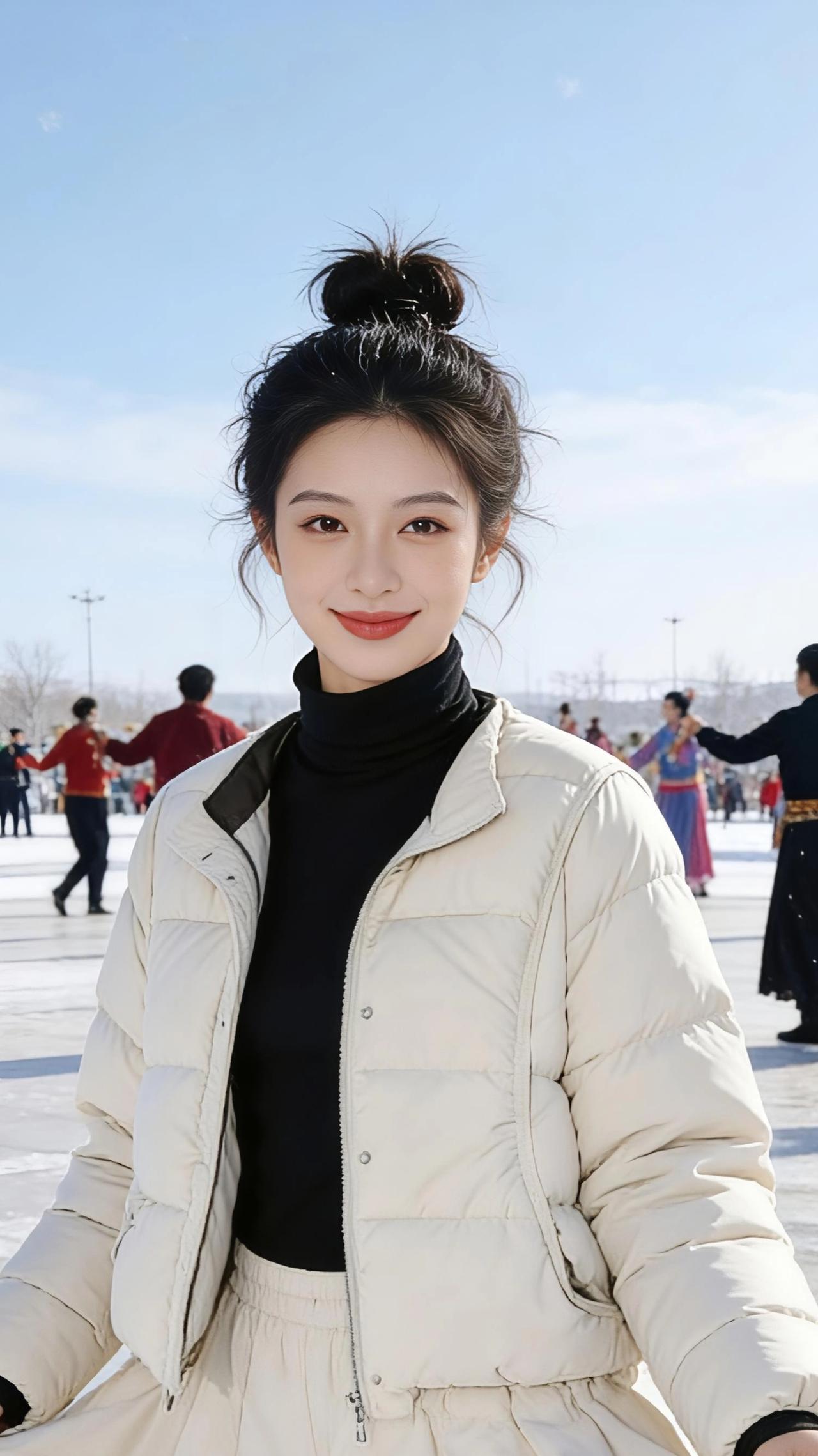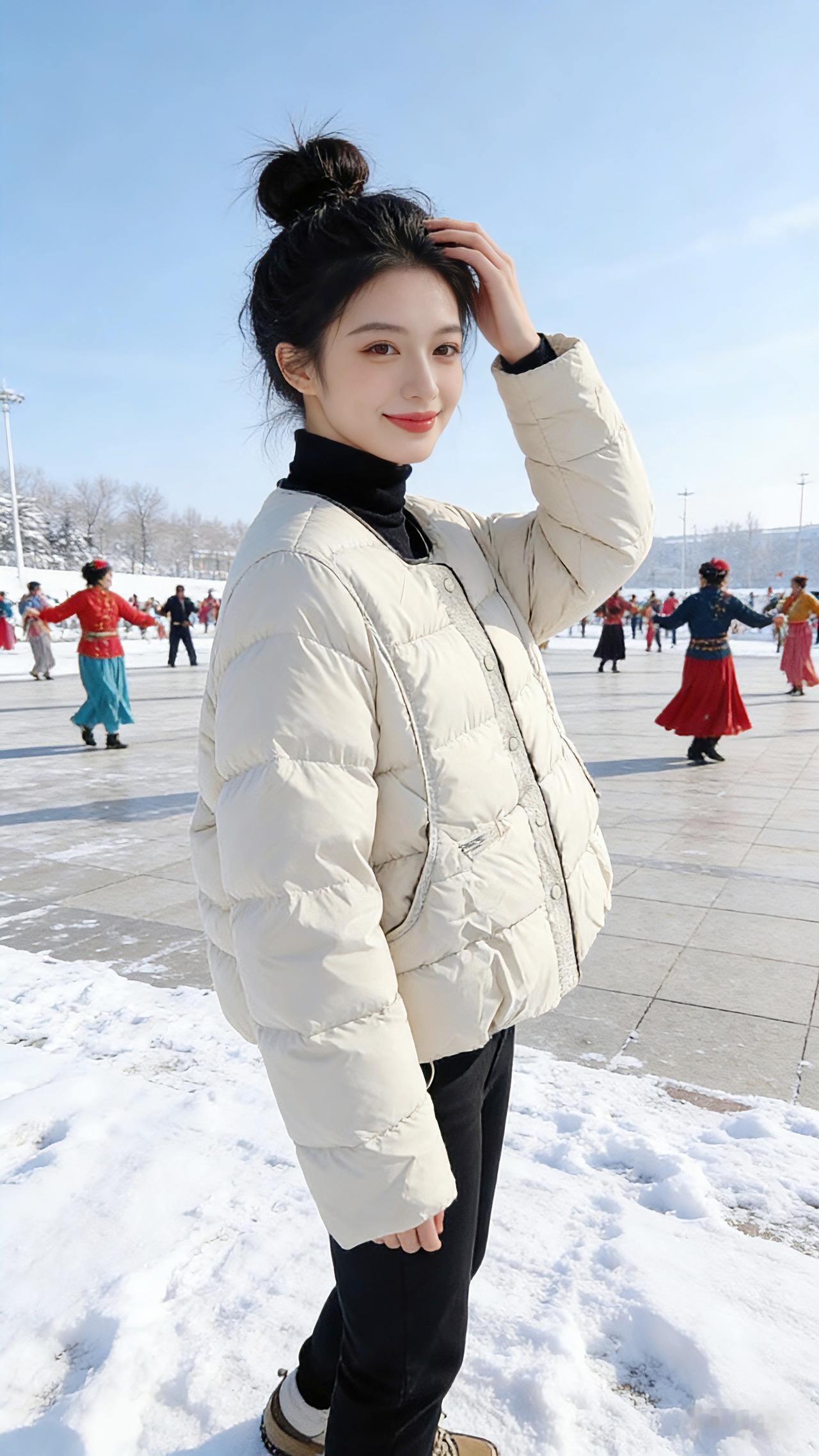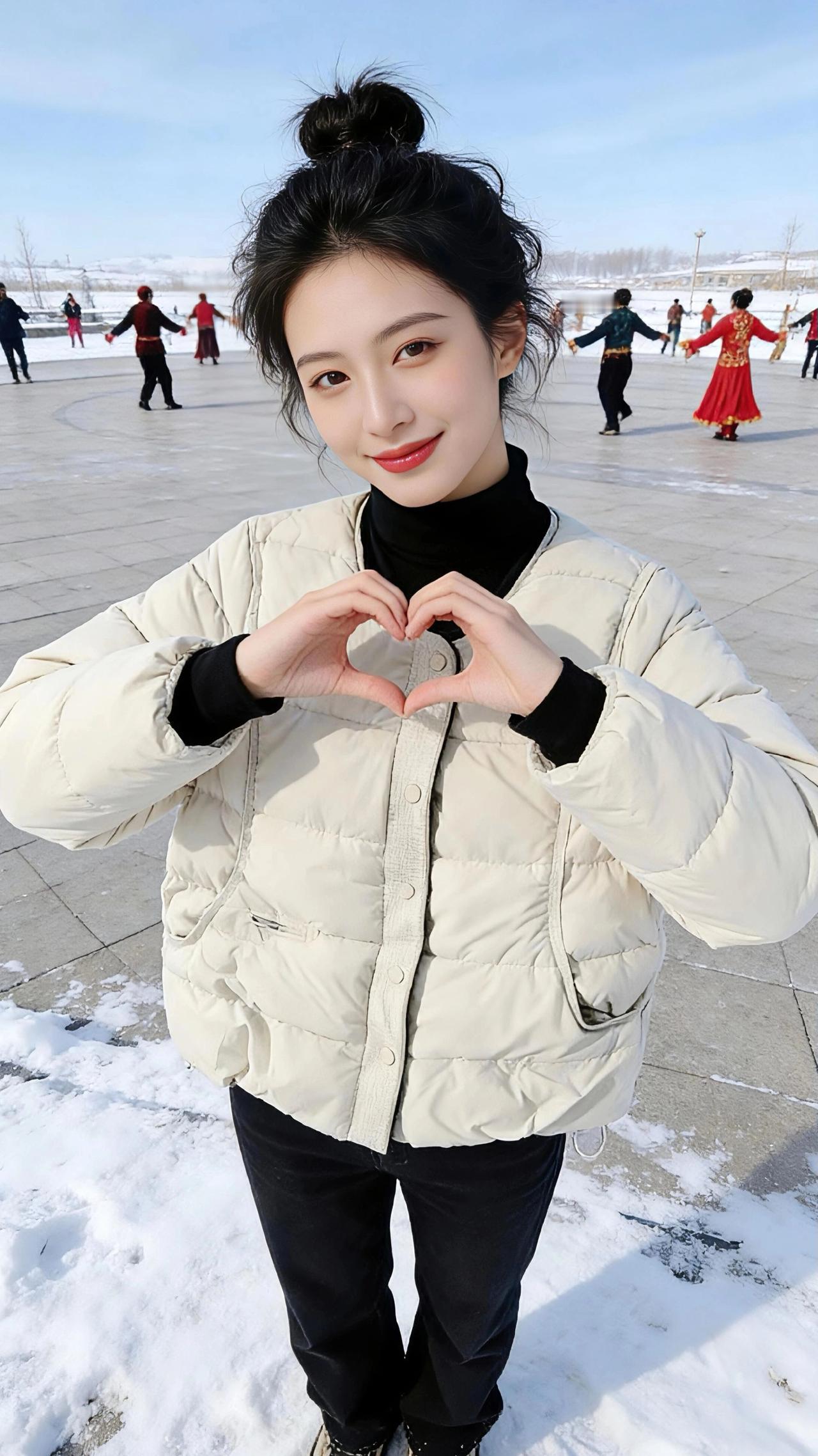 雪日欢歌 北国的冬日,晴光泼洒在皑皑雪地上,晃得人眼睫都染上亮白。我立在广场的雪边,浅米色的羽绒服裹着周身的暖,黑色高领衫收住颈间的风,丸子头的碎发被寒风吹得轻轻扬着,倒添了几分随性的鲜活。 身后是喧腾的欢歌,彩衣的身影在雪地上旋出明艳的弧,红的绸、绿的袖,是东北大秧歌独有的热烈,把冬日的清冷揉成了滚烫的欢喜。我抬手拢了拢耳边的碎发,指尖触到冰凉的风,却又被心底的暖意裹住。脚下的雪咯吱作响,像是附和着秧歌的鼓点,蓝天澄澈得没有一丝云,阳光落在身上,暖融融的,竟让人忘了这是数九的寒天。 伸手比出心形时,目光掠过那些舞动的身影,他们的笑闹声混着风飘过来,成了这雪日里最动听的背景音。原来冬日从不是只有沉寂,在这片被白雪覆盖的土地上,热烈的生活气总能破开寒意,像秧歌的红绸一样,在天地间舞出万般热闹。而我站在这雪与欢歌之间,成了冬日里一抹温柔的剪影,也成了这份热闹里,最惬意的看客。 高级感穿搭 新年穿搭 百大红人新年出片战袍 棉服外套