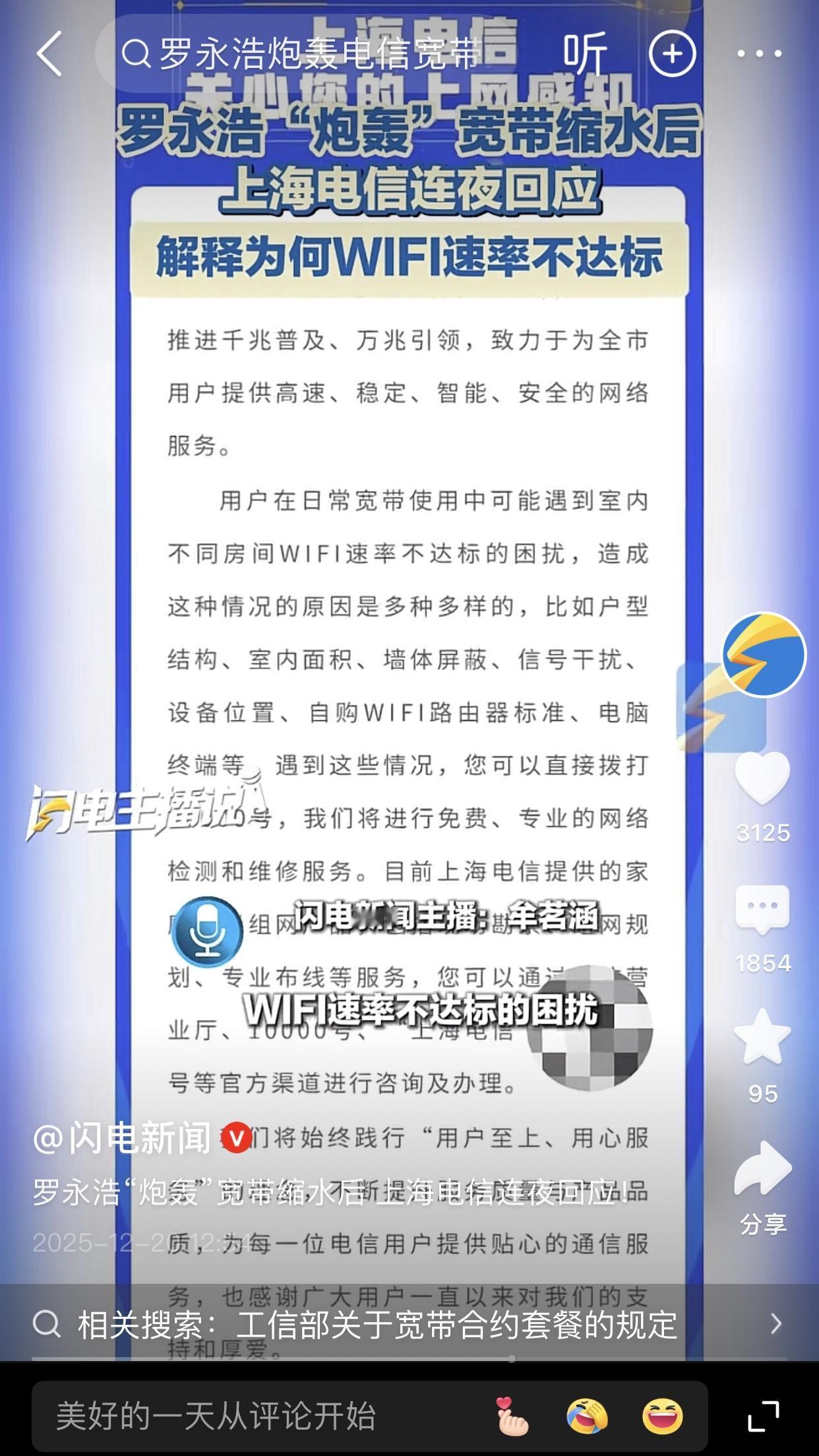 老罗就是闲不住的人! 近日又炮轰上海电信宽带“缩水”,WiF网速不达标,投诉之后经维修人员检修又回归正常,过几天又恢复原状。 上海电信给出的回复是,这个问题是很多复杂的因素造成:“比如房子结构,路由器质量,摆放等等各种各样的问题造成!”很多人疑惑,为什么维修人员一来就又达标了,过几天又不行了?老罗说的是不是真的呢? 其实,很多人不知道,不管哪个运营商,给用户的网络不可能是独立公网lP,用户是要分享一个由运营商提供的公共出口,出口之内得网络是内网地址,光纤是分芯的每家确实是独立的,自购的无线路由器速度比有线慢很多,丢包率也高。 还有不要盲目升级,如果是老房子,就坚决不要升级,因为老房子的线是不达标的,5类线不支持千兆速率,升级后你的路由器也要跟着升级,不然你就算升到1000M,路由器只支持100M,也是没用的。所以怀疑老罗购买独享的那1000兆宽带也是这个原因造成,不关运营商的事。