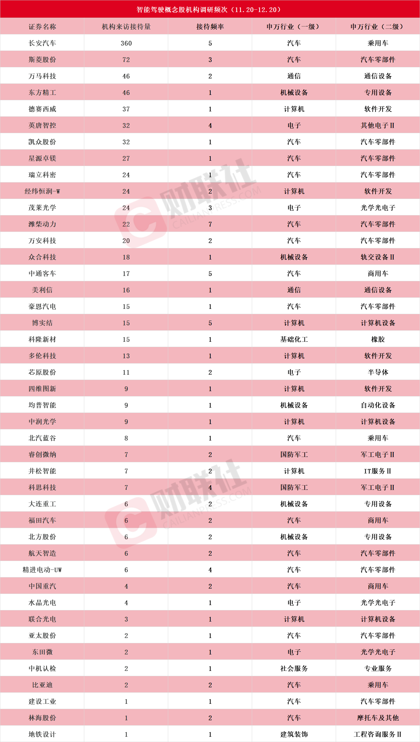 Choice数据显示,截至发稿,近一个月(11.20-12.20)获机构调研的智能驾驶概念股,包括长安汽车、斯菱股份、万马科技、东方精工、德赛西威、英唐智控、凯众股份、星源卓镁、瑞立科密、经纬恒润-W、茂莱光学、潍柴动力、万安科技、众合科技、中通客车、美利信、豪恩汽电、博实结、科隆新材、多伦科技、芯原股份、四维图新、均普智能、中润光学、北汽蓝谷、睿创微纳、井松智能、科思科技、大连重工、福田汽车、北方股份、航天智造、精进电动-UW、中国重汽、水晶光电、联合光电、亚太股份、东田微、中机认检、比亚迪、建设工业、林海股份、地铁设计,具体情况如下: