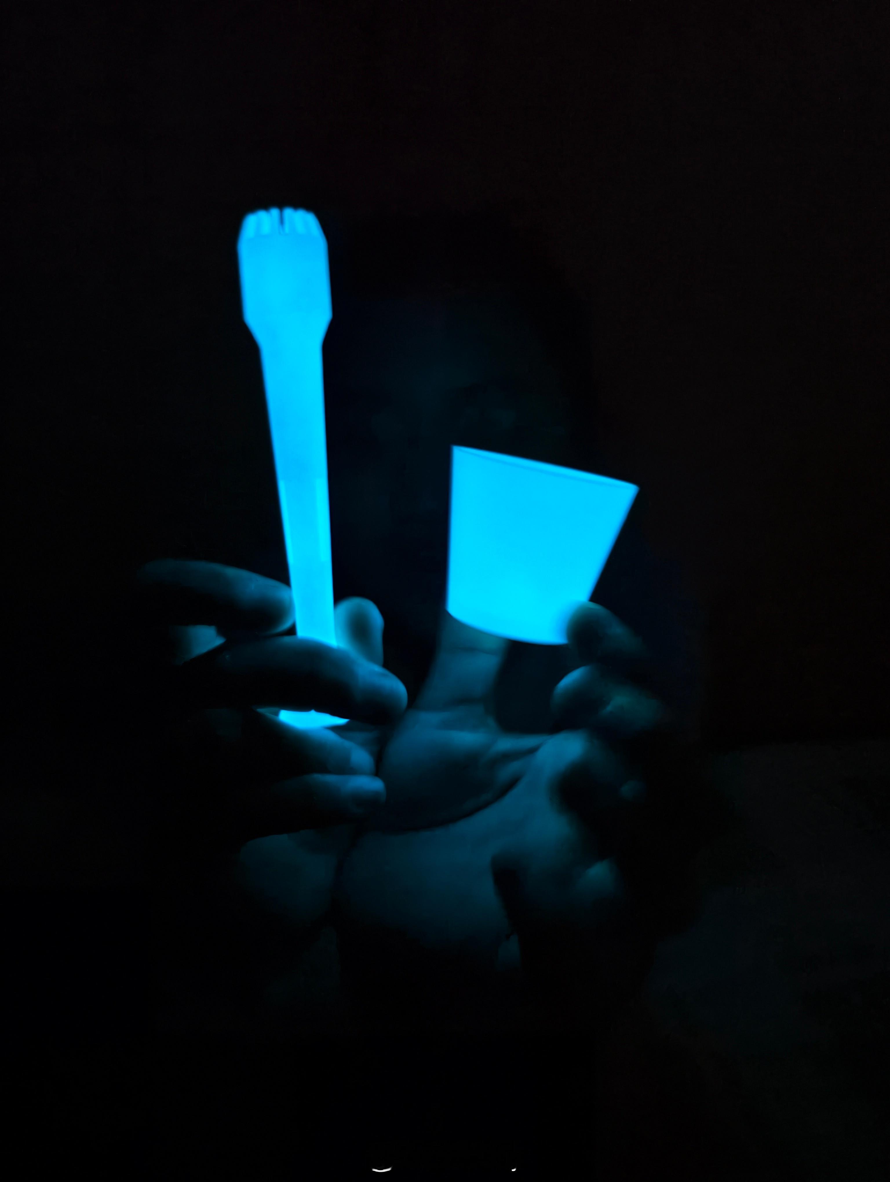 夜光材料3D打印的吹泡泡管用紫光灯照一下在夜里非常亮要是吹出来的泡泡能有夜光就更帅了