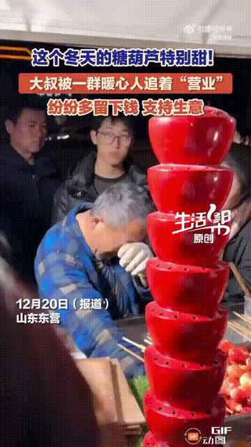 山东东营一位老人的儿子不幸患癌去世,留下了三个年幼的孩子,于是老人一力承担起抚养三个孩子的责任,在街上摆摊卖冰糖葫芦。 附近的群众得知这件事后,纷纷过来支持老人,有人给多了现金,就让老人不用找了,有人则干脆扫码,多付了不少钱。 老人其实知道群众都在帮助他,因为无论他走到哪里,摊位前永远都挤满了顾客,有些人甚至专门等着他,所以也流下了感激的泪水。 网友看完这段视频,都觉得这位老人实在是太不容易了。 他的年龄已经不小了,本该是在家里安享晚年,弄孙为乐,可他的儿子却不幸生病去世,只留下三个年幼的孩子。 说实话,这年头照顾一个孩子都不容易了,何况要照顾三个,为了让三个孩子继续上学,他也不得已出来摆摊。 所幸他遇到了温暖的群众,他们虽然什么话也没说,却用行动默默帮助着老人,无论钱多钱少,都是对老人的支持。 这件事让我们感受到了美好,正所谓一方有难,八方支援,其实很多人的内心都是非常善良的,会尽心尽力地帮助有需要的人,这样的举动实在是太暖心了。大家怎么看呢?
