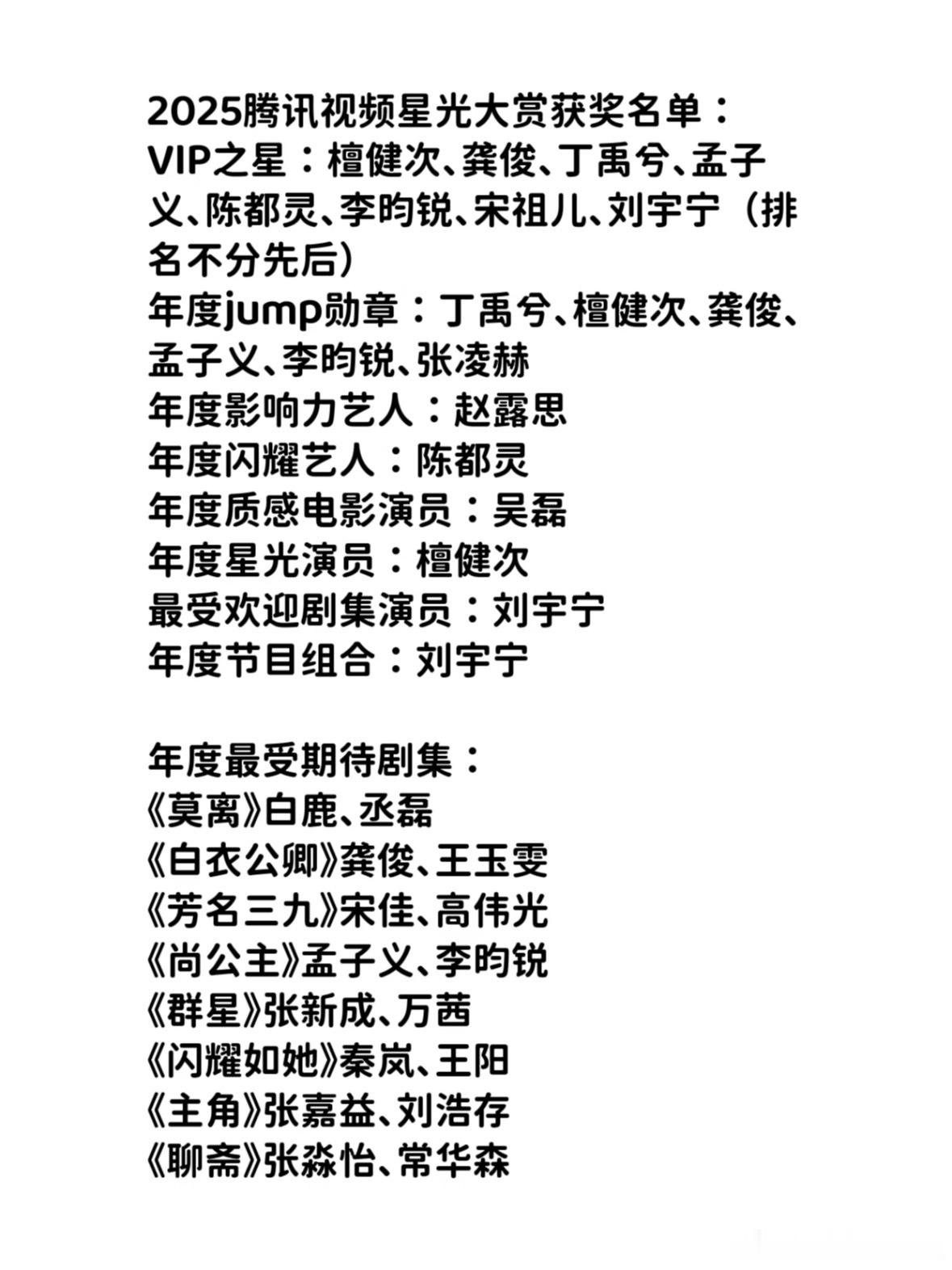 星光大赏2025腾讯视频星光大赏获奖名单来啦!赵露思拿下年度影响力艺人陈都灵获年度闪耀艺人吴磊获年度质感电影演员檀健次、刘宇宁也斩获多项荣誉还有《莫离》《白衣公卿》等剧集入选年度最受期待剧集!