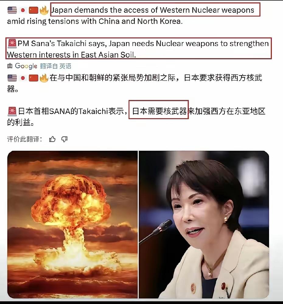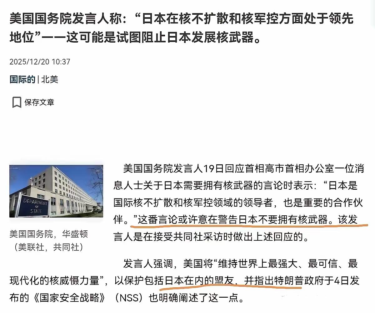 19日,美国国务院发言人对日本政府高官说“日本应该拥有核武器”做出反应:“日本是国际核不扩散和核军控领域的领导者,也是重要的合作伙伴。” 这话听着体面,实则满是虚伪!明眼人都能看出来,美国这是表面打圆场,暗地里揣着自己的小算盘。发表“拥核”言论的不是普通政客,而是日本首相候选人高市早苗身边的核心智囊——专门负责安全政策制定的关键人物,这种身份的人公开放话,绝非一时兴起。 高市早苗阵营近期在安全政策上的试探就没停过。之前防卫大臣小泉进次郎公然讨论装备“核潜艇”,高市早苗自己也多次暗示要修改“无核三原则”中“不引进核武器”的条款,被追问时始终回避,不给出明确答复。这次官员放风,说白了就是一次政治试探——看看国内外反对声浪大小,要是压力可控,后续很可能就把“试探”变成实质性动作。 大家千万别被“个人观点”的说法忽悠。日本早就不是“没能力拥核”,而是“敢不敢”的问题。国际原子能机构最新数据显示,日本目前囤积的分离钚已达47.8吨,理论上能制造6000多枚核弹头,仅本土就储存10.8吨,其中还包含美国冷战时期秘密提供的武器级钚。要知道,制造一枚原子弹只需6-8公斤钚,这库存规模,足够让它瞬间跻身全球第三大核武国家。 技术上更无门槛。日本拥有完整的核燃料再处理体系,青森县的工厂每年还能新增8吨钚,而民用核电消耗的钚还不到库存零头,所谓“民用需求”纯粹是借口。它的H3系列火箭稍加改造,就是射程上万公里的洲际导弹;苍龙级潜艇也能轻松改装为潜射核平台。相关军事专家结合日本核工业基础测算,只要政府松口,183天内即可造出战术级核武器。 最讽刺的是,日本是二战里唯一挨过原子弹的国家。广岛、长崎的核爆惨状,几十万平民伤亡,原爆幸存者几十年的痛苦挣扎,这些历史才过去80年,高市早苗阵营就选择性遗忘了。当年日本喊着“无核三原则”,靠着“核受害者”身份博取国际同情,现在转头就想自己造核弹,这不是打自己脸,是背叛了所有反核人士的努力。 日本国内的反对声已经炸了锅。日本共产党参议员直接痛批“忘记历史的人没资格当政”,立宪民主党议员警告“这是要重蹈毁灭老路”,长崎原子弹受害者团体气得直言“这是给我们80年的努力泼冷水”,还有民众自发前往首相官邸前抗议。连自己人都看得明白,拥核不是“自保”,是把整个国家推向战争边缘。 美国的回应根本不是真认可日本“核不扩散领导者”的身份。它心里比谁都清楚,一旦日本拥有独立核打击能力,美日同盟的“保护与服从”关系就彻底崩塌。日本还会乖乖交“保护费”?还能容忍美军在冲绳的基地?答案显然是否定的。所以美国才用温和措辞“敲打”,本质是想告诉日本:核保护伞我能给,但伞柄绝不能交到你手里。 中俄的态度就直接多了。中国外交部明确点破,这暴露了日本右翼“复活军国主义”的野心,警告它别试探国际底线。俄罗斯更是“零容忍”,直言敢碰核红线就会遭坚决回应。两国为啥强硬?因为日本拥核的连锁反应太可怕——韩国已有75%民众支持自主研发核武,一旦日本突破红线,东亚很可能陷入核竞赛,整个地区安全格局都会被打乱。 你觉得日本的拥核试探会真的落地吗?如果真发生核扩散,最先受影响的会是谁? 一个国家的安全,从来不是靠核武器撑起来的。日本无视历史教训,借着“安全环境严峻”的借口扩充军力、试探核红线,本质是军国主义思想在抬头。美国的双重标准,看似维持同盟,实则埋下更大安全隐患。战后国际秩序的底线不容突破,“无核三原则”不是可以随意修改的空话,任何企图挑战核禁忌的行为,最终只会自食恶果。 各位读者你们怎么看?欢迎在评论区讨论。