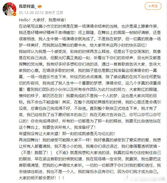 梓渝演唱会千字小作文 梓渝文笔好真诚 梓渝文笔好真诚,梓渝演唱会千字小作文,是从文字都能感受到来自梓渝的开心和激动的心情啊,首次演唱会落下帷幕,期待下一站聚光灯真正亮起一刻,活力满分的小梓渝的出现啦~梓渝感谢蓝海