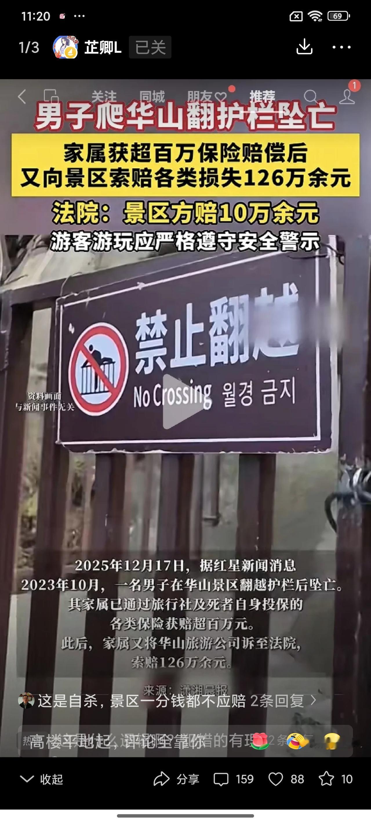 华山护栏都拦不住他!男子翻越坠亡,家属获百万保险赔偿后,又起诉景区索赔126万,法院判了! 2023年,一名男子在华山游玩,专挑最险峻的山脊路段,无视齐胸高的护栏和安全警示,直接翻越过去,结果失足坠崖身亡。 监控清晰记录,全程无人推搡,完全是他自己一意孤行。 原本此事顶多让人感叹一句“不珍惜生命”,没想到后续更荒唐:家属先拿到旅行社和个人保险共计110万赔偿,接着就把景区告上法庭,称护栏不够高、救援不及时,索要126万赔偿! 景区直呼冤枉:该有的警示标识、安保配置一应俱全,总不能把整座华山封起来才叫安全吧? 近日,法院判决出炉:男子承担90%的责任,景区因救援不够及时,承担10%的补充责任,赔偿10万出头。 此判决一出,网友们议论纷纷: 有人吐槽“这是把索赔当生意做?保险赔完告景区,算盘打得老远都能听见”; 有人为景区鸣不平“护栏:我到底多高才能拦住作死的人?”; 也有人认为“判景区赔10万合理,不是帮家属,是提醒景区做好救援,对其他游客负责”。 我着实感到唏嘘:规则就在眼前,却偏要以身犯险,最后让他人为自己的任性负责,即便景区只承担10%的责任,也挺委屈的。说到底,生命是自己的,护栏不是跨栏,别拿侥幸赌结局。 你觉得这10万赔偿该不该给? 景区坠崖 社会风气与什么有关?