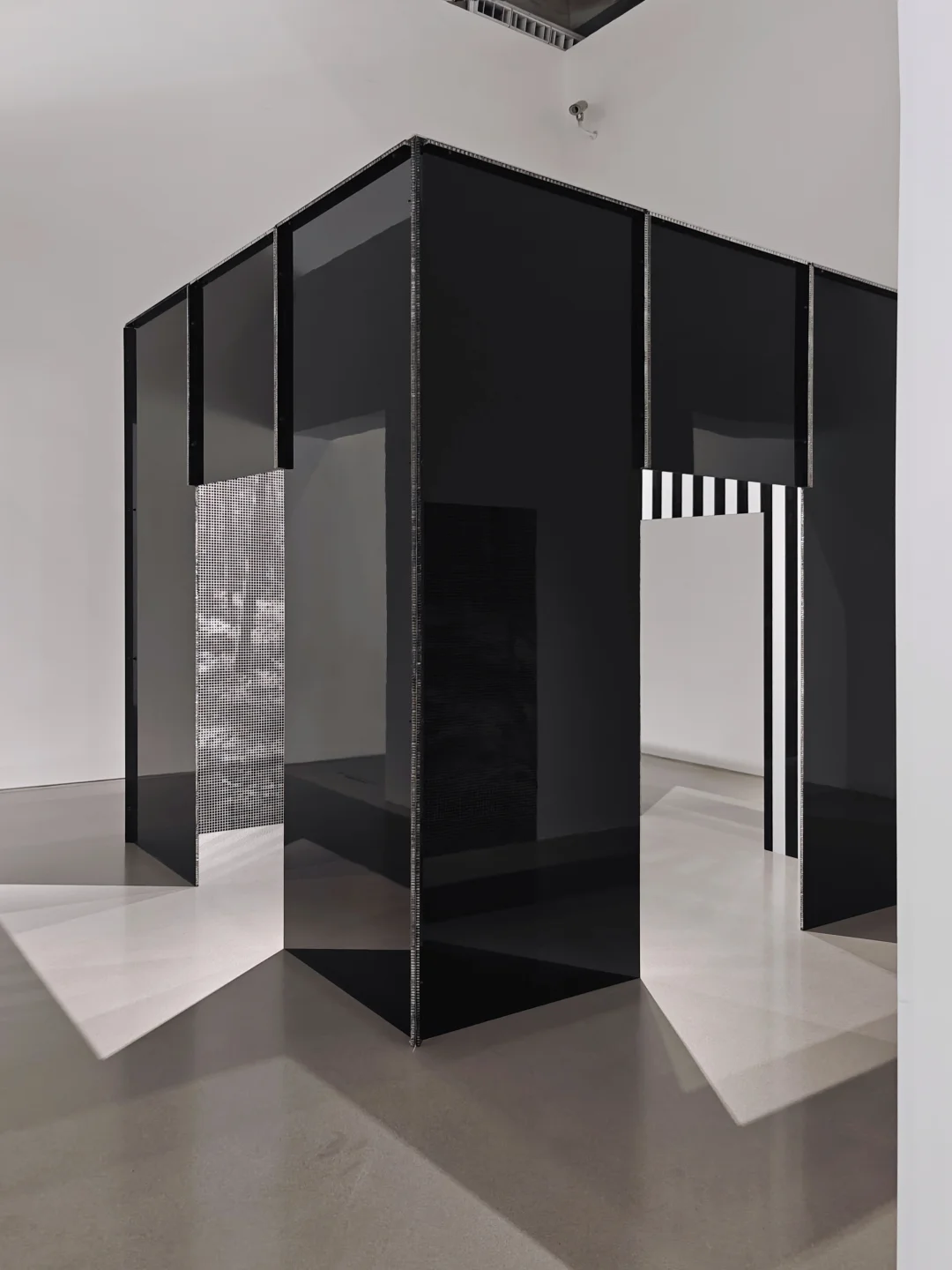 结合两位艺术家标志性的创作语言,垂直条纹图案切割、重组空间,打破传统空间的连续性,探讨“碎片化景观”与“幽灵性记忆”主题