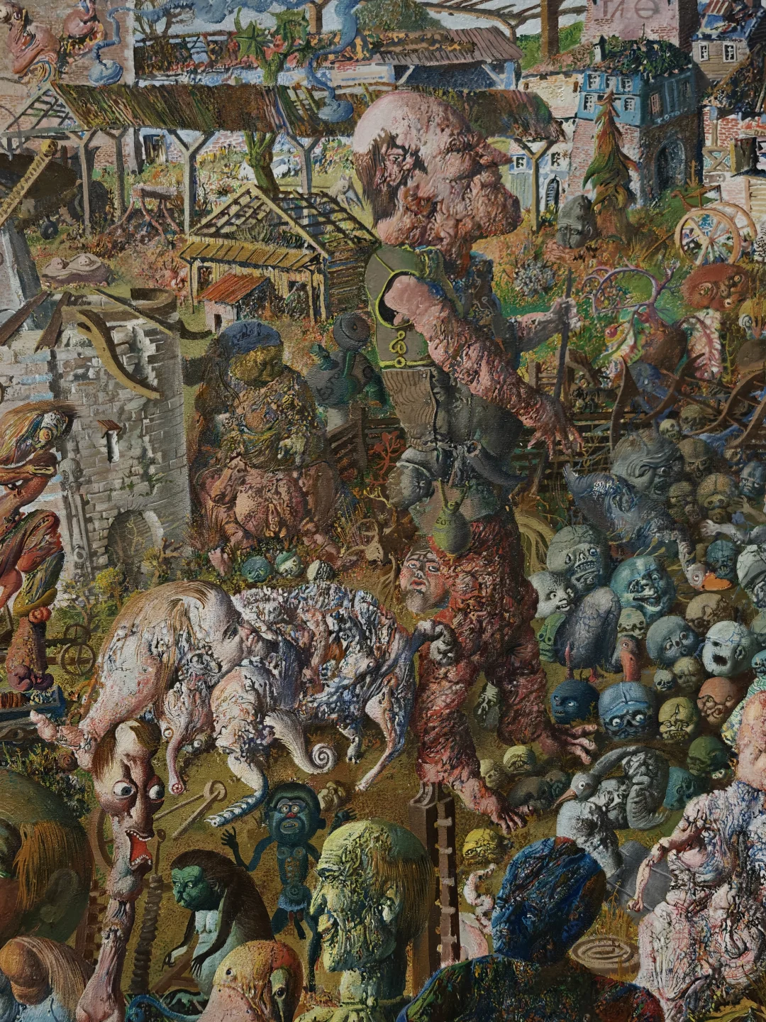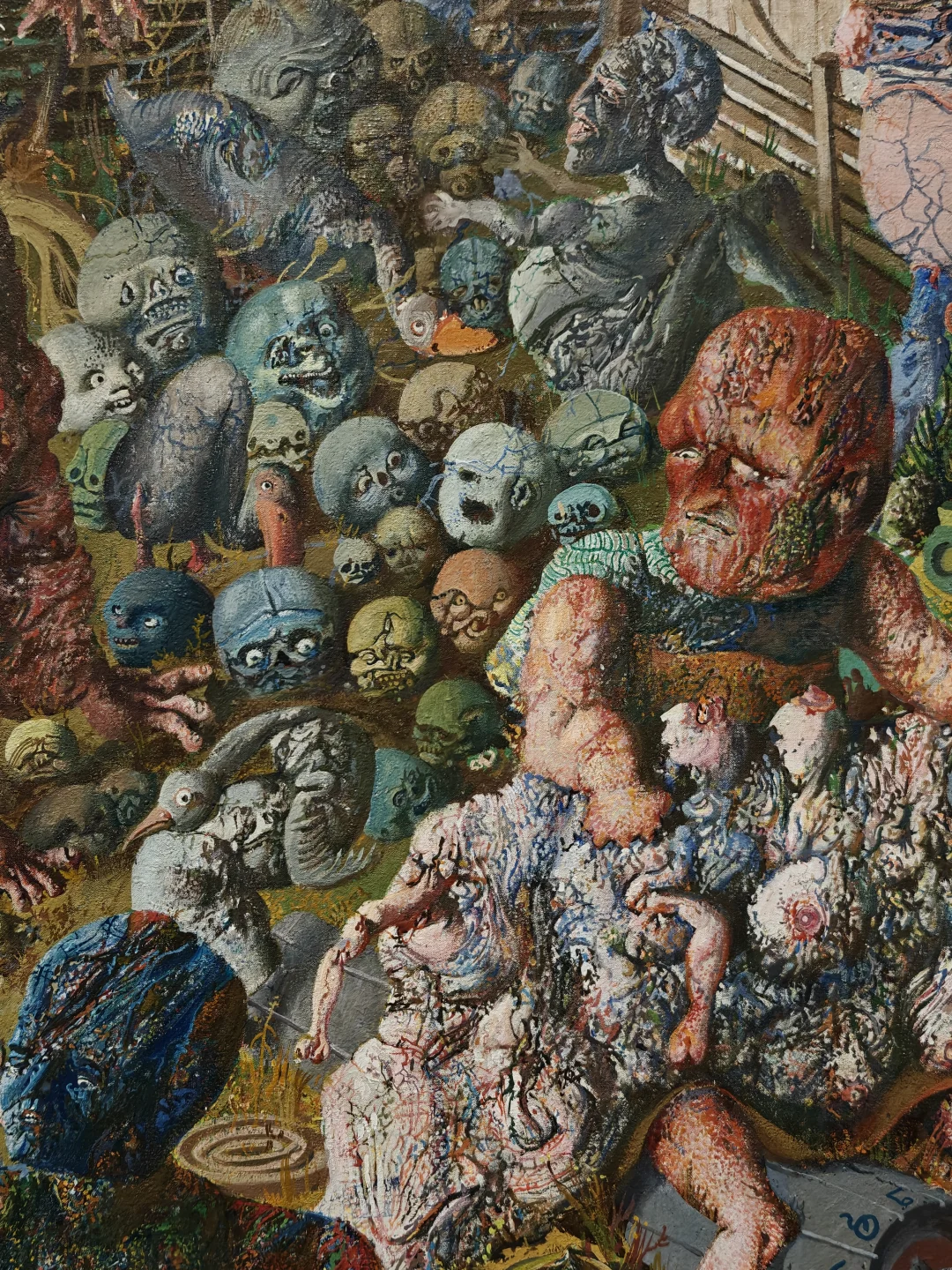 怪诞、扭曲的超现实主义风格,对人类苦难深刻描绘。该幅巨作将法国新现实主义艺术家Requichot的“物质病理学”与自身对后工业社会的批判结合,构建了一幅充满精神张力的末日寓言