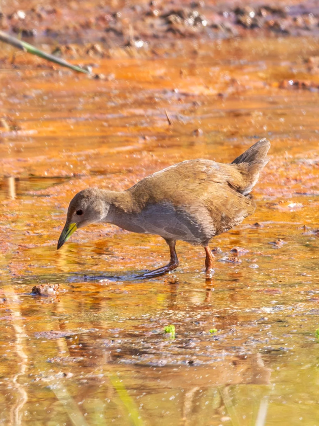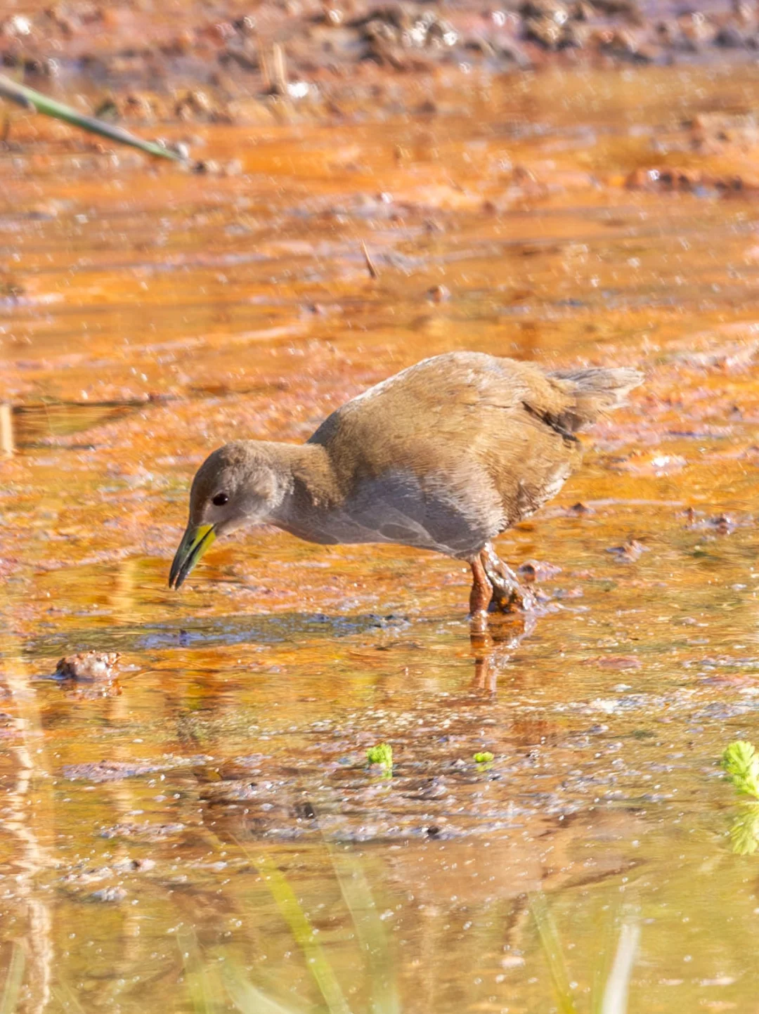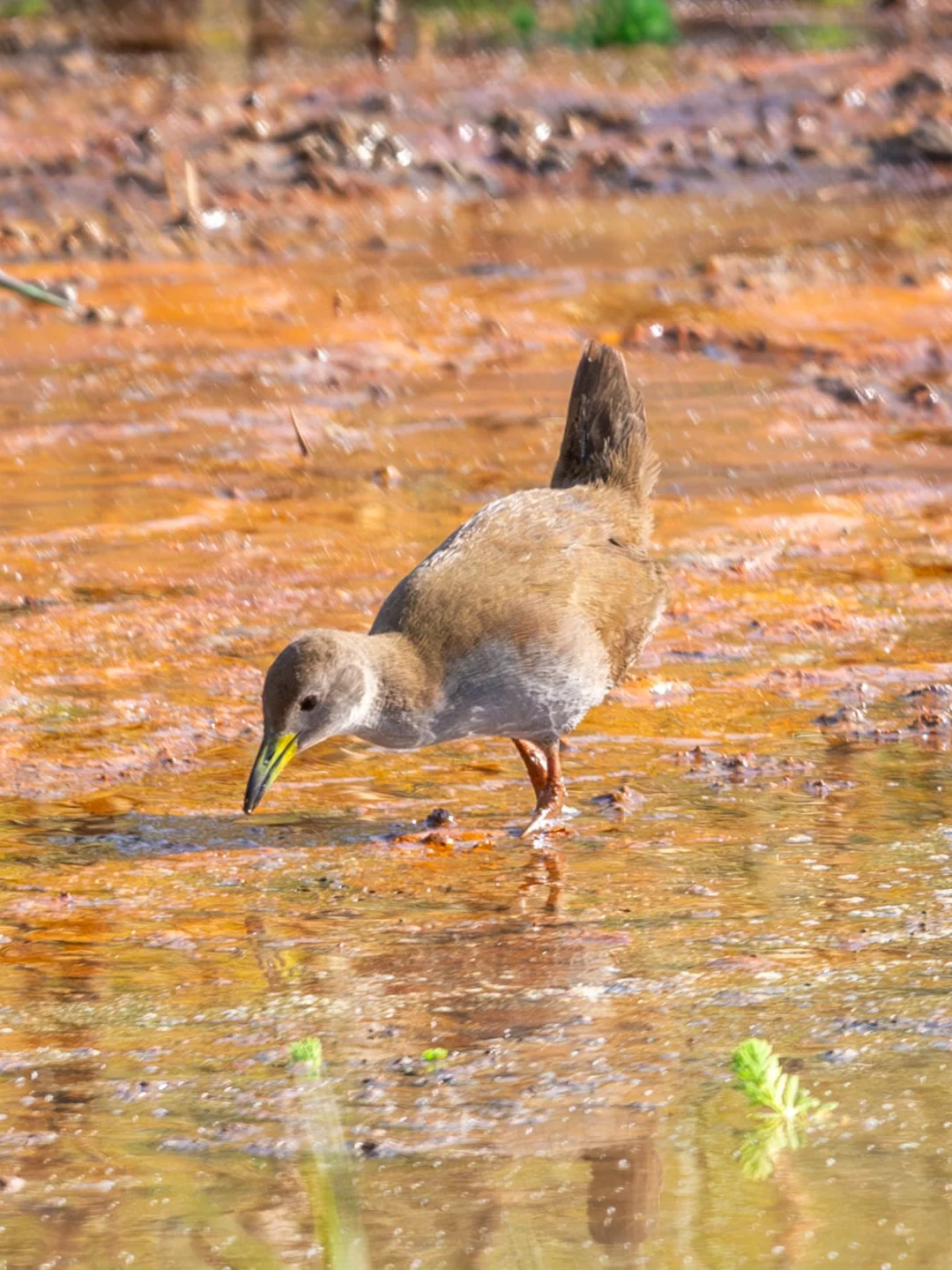之前第一次见到是在董寨,当时在车上看到乡间小路上站着一只,刚举起相机就飞快跑了。在深圳大鹏寻过也没看到,倒是听到那里的工人津津有味的谈论他们见(吃)到的红脚田鸡。在广州太子和下溪的倒是挺稳的,一去就看到了。这次看到的这只红脚田鸡在一片红色湖水的浅滩上觅食,看上去倒像是它的腿被湖水染红了。