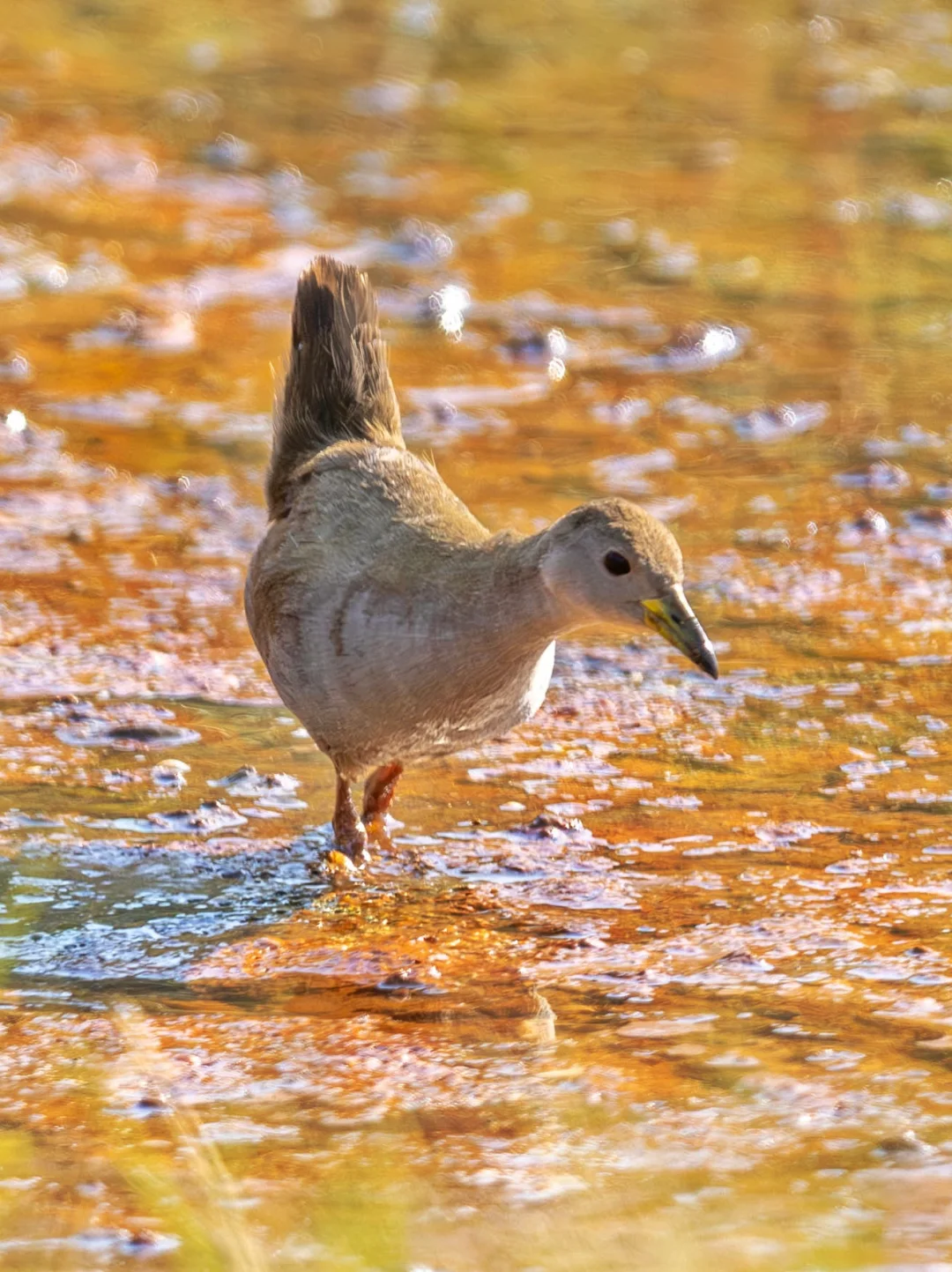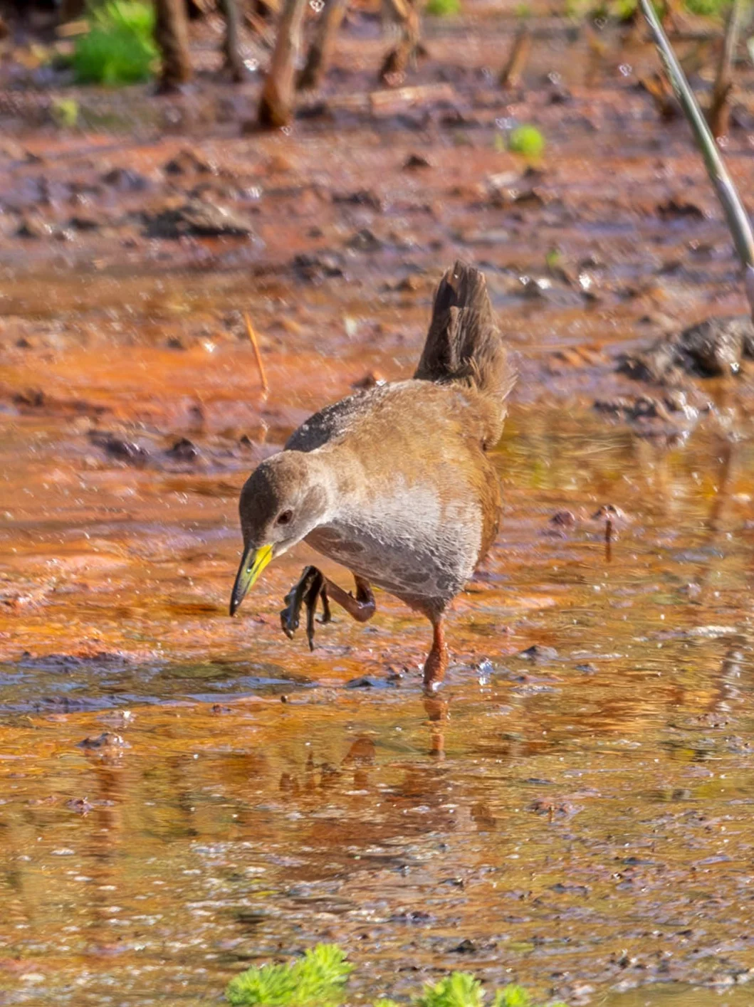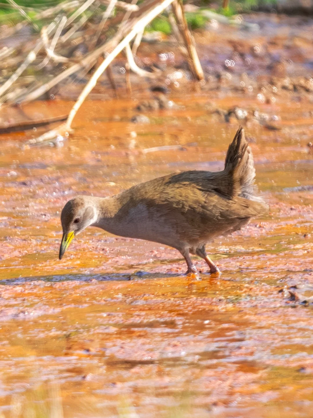 之前第一次见到是在董寨,当时在车上看到乡间小路上站着一只,刚举起相机就飞快跑了。在深圳大鹏寻过也没看到,倒是听到那里的工人津津有味的谈论他们见(吃)到的红脚田鸡。在广州太子和下溪的倒是挺稳的,一去就看到了。这次看到的这只红脚田鸡在一片红色湖水的浅滩上觅食,看上去倒像是它的腿被湖水染红了。