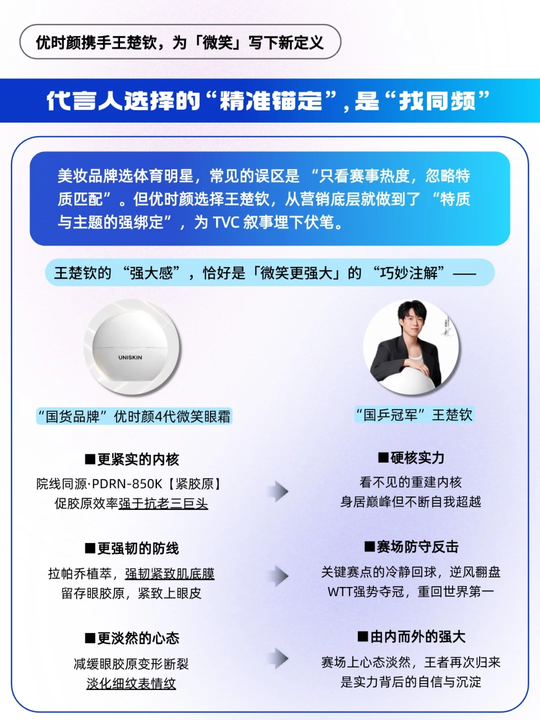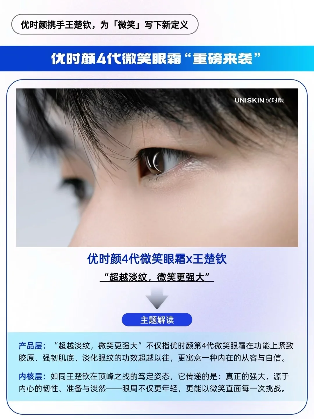 在新品营销常陷入“明星露个脸、产品堆参数”的套路时,优时颜此次为第 4 代微笑眼霜打造的动作,借着“老搭档新共鸣”的巧劲,与王楚钦一同诠释了“从内到外的强大,才是更强大”的精神内核💯