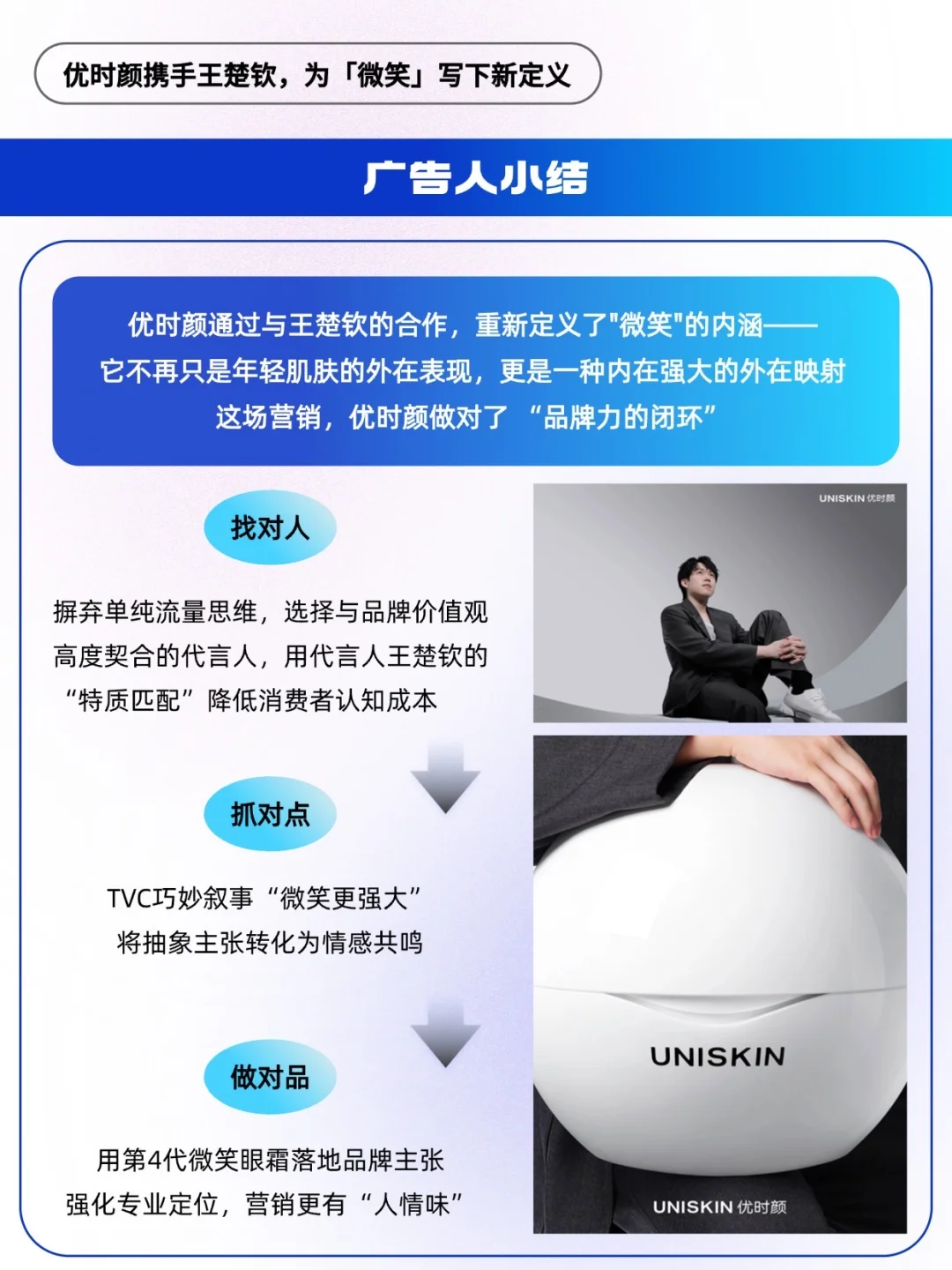 优时颜(UNISKIN)携手品牌代言人王楚钦,在既有代言合作的基础上,用一支「超越淡纹,微笑更强大」主题 TVC,让“代言人特质”与“新品价值”完成了更深度的绑定——