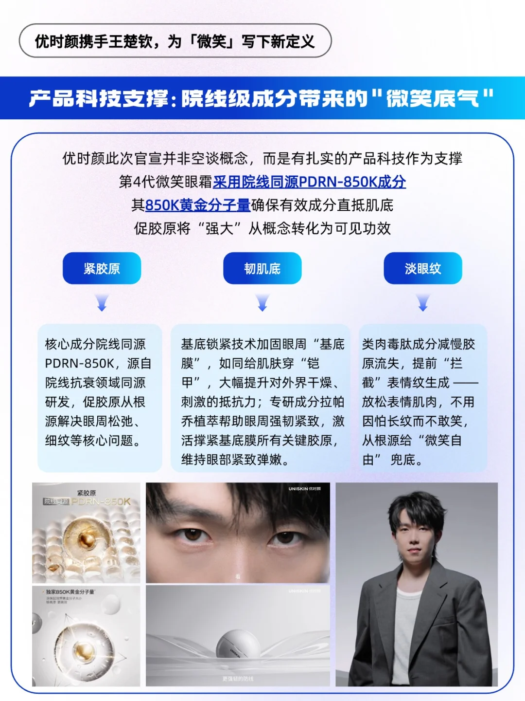 🔵从产品层看,“超越淡纹,微笑更强大”不仅指优时颜第4代微笑眼霜在功能上紧致胶原、强韧肌底、淡化眼纹的功效超越以往,更寓意一种内在的从容与自信。新品核心成分院线同源PDRN-850K,凭借其黄金分子量实现高效渗透吸收,显著促眼胶原,为眼周肌肤构建坚实的支撑网络。